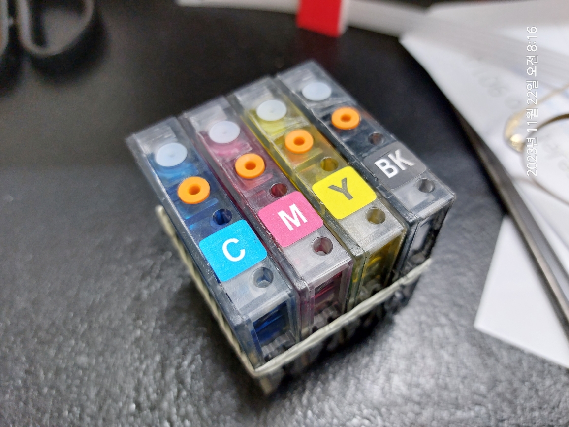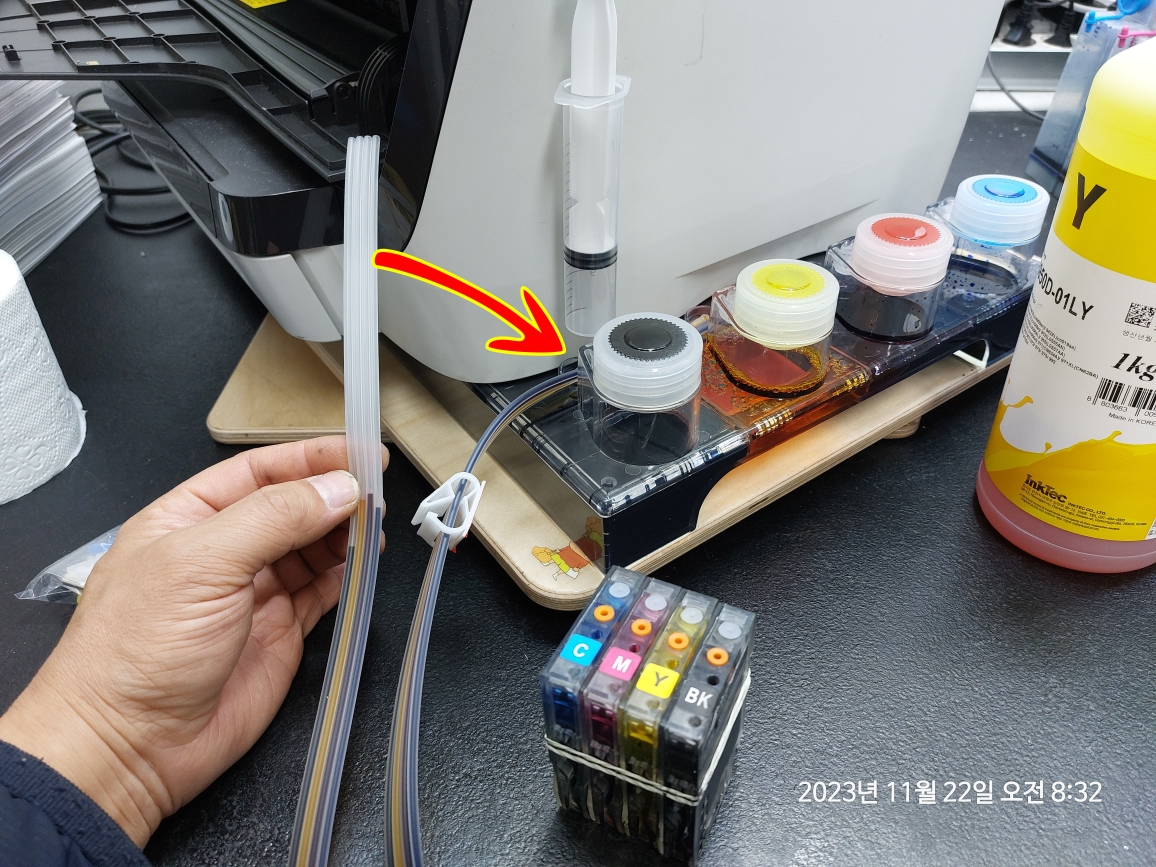 호스의 잉크 색상 확인을 좀 편하게 하고자 주사기 등을 잉크 호스에 물려
