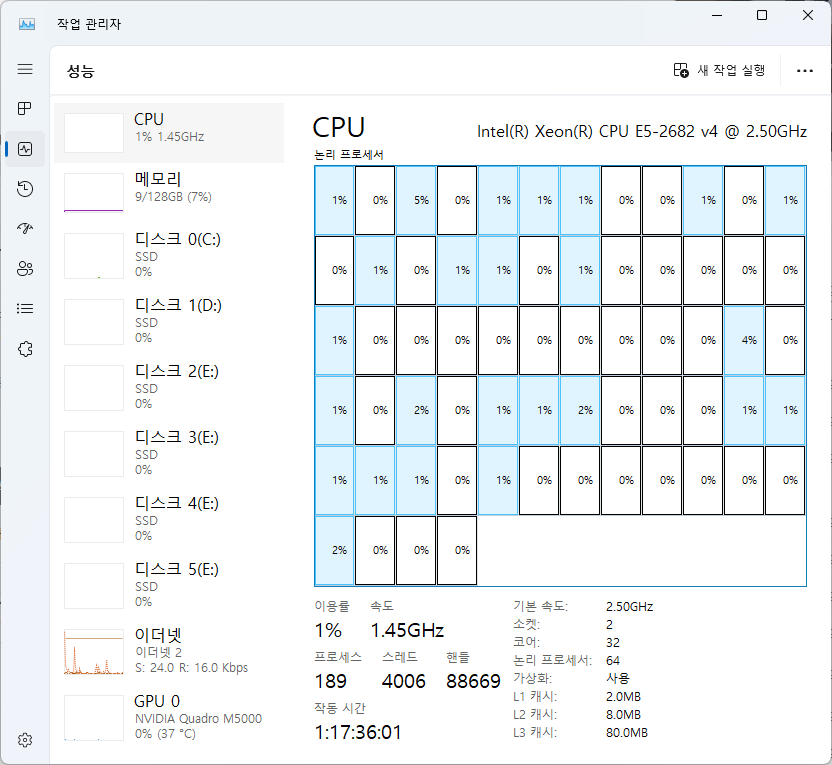 CPU : Xeon CPU E5-2682 v4 2.5)Ghz 듀얼 장착
