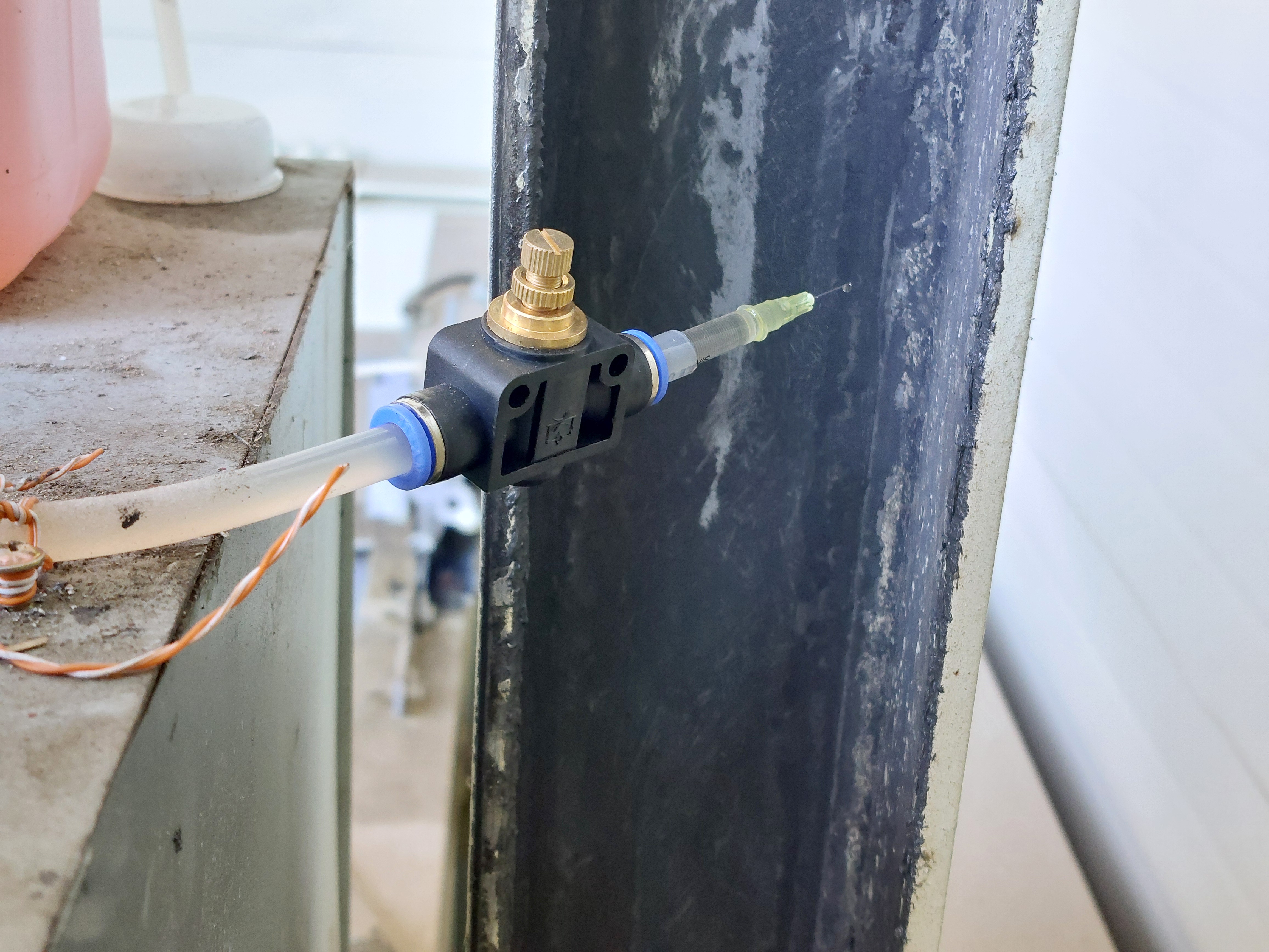 호스 중간에는 공압용 스프트 밸브를 달아 떨어지는 속도를 조절하게끔 하였습니다.