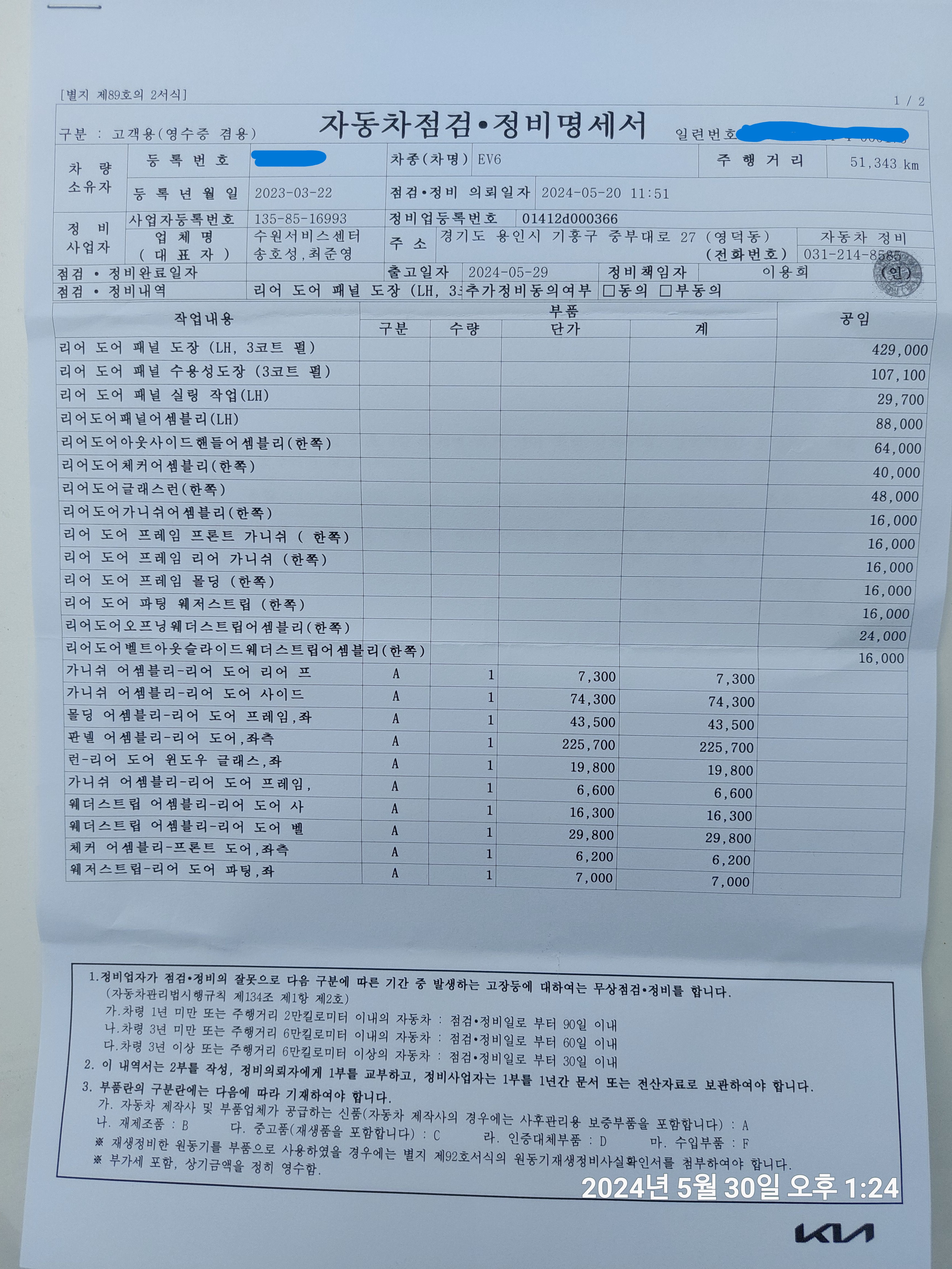 기아자동차 수원서비스센터에 입고 후