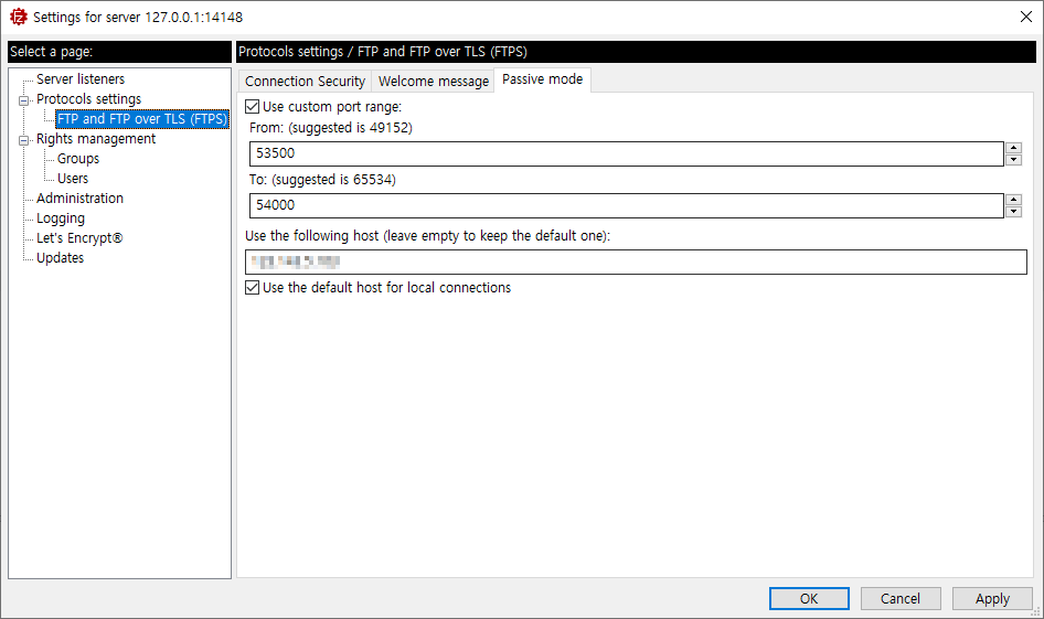 그리고 위에서 설정한 패시브 포트를 아래와 같이 지정해 주면 끝입니다.
