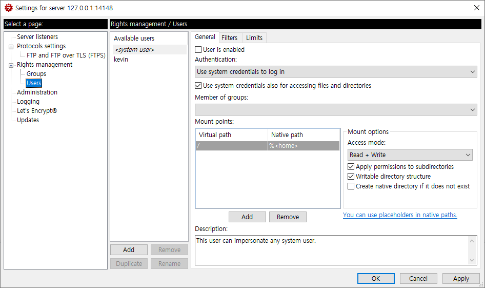 추가로 USERs 설정에서 사용자 추가 등의 작업을 해주어야 클라이언트로 접속이 가능하다는 점 참고하시고요.