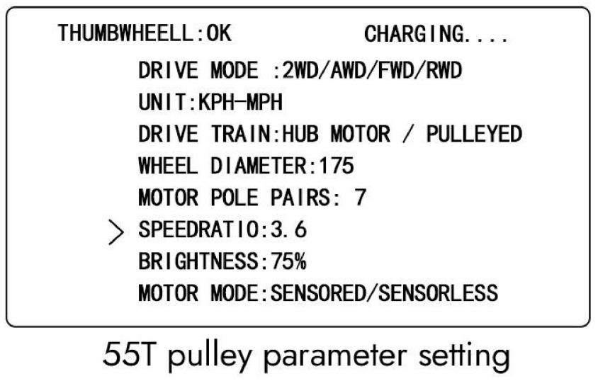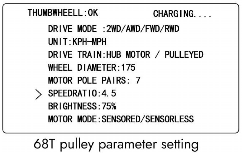 메뉴 페이지에 들어갈 때 SPEED RATIO를 조작해야 합니다. 68T 풀리 사용시 값은 4.5, 55T 풀리 사용시 값은 3.6 입니다.