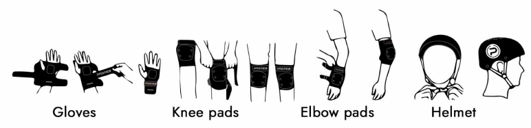 스케이트보드를 타기 전에 보호 장비를 착용하십시오: 헬멧, 보호 패드(무릎 패드, 팔꿈치 패드) 및 장갑.