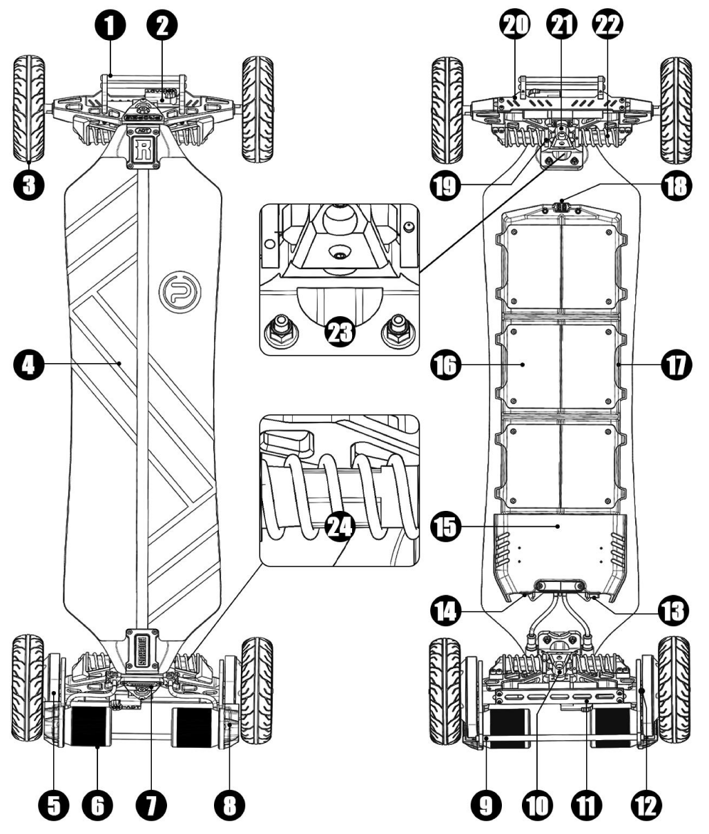 • 켜기: 전원 버튼은 모터 쪽과 가까운 스케이트보드 상부에 설치된 자체 재설정 스위치입니다.