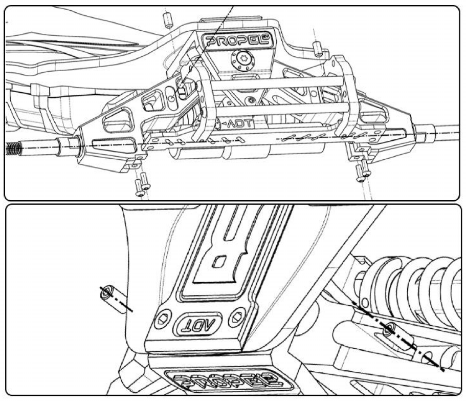 댐핑 보호 부품의 설치는 매우 간단합니다. 먼저 그림과 같이 구성품을 연결한 후, 하단 보호판 나사 4개, 상단 나사 2개를 번갈아 조여 스케이트보드에 단단히 고정시켜줍니다.