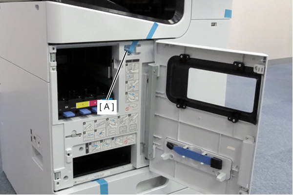 오른쪽 문(A)의 운송 보호 장치는 오른쪽 문을 열거나 테이프를 사용자 쪽으로 당겨서 제거할 수 있습니다.