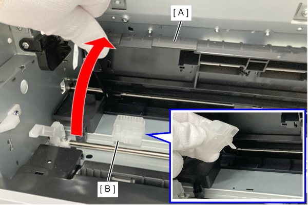 | 덮개(A)를 열고 운송 고정 부품(B)을 표시된 위치에 보관하세요.
