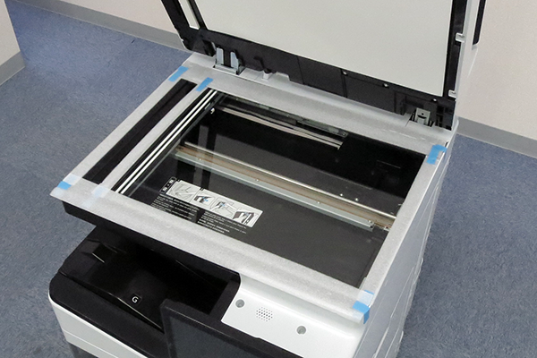 본체 아래의 비닐 시트를 본체에 고정하고 있는 파란색 테이프 4개를 벗겨냅니다.