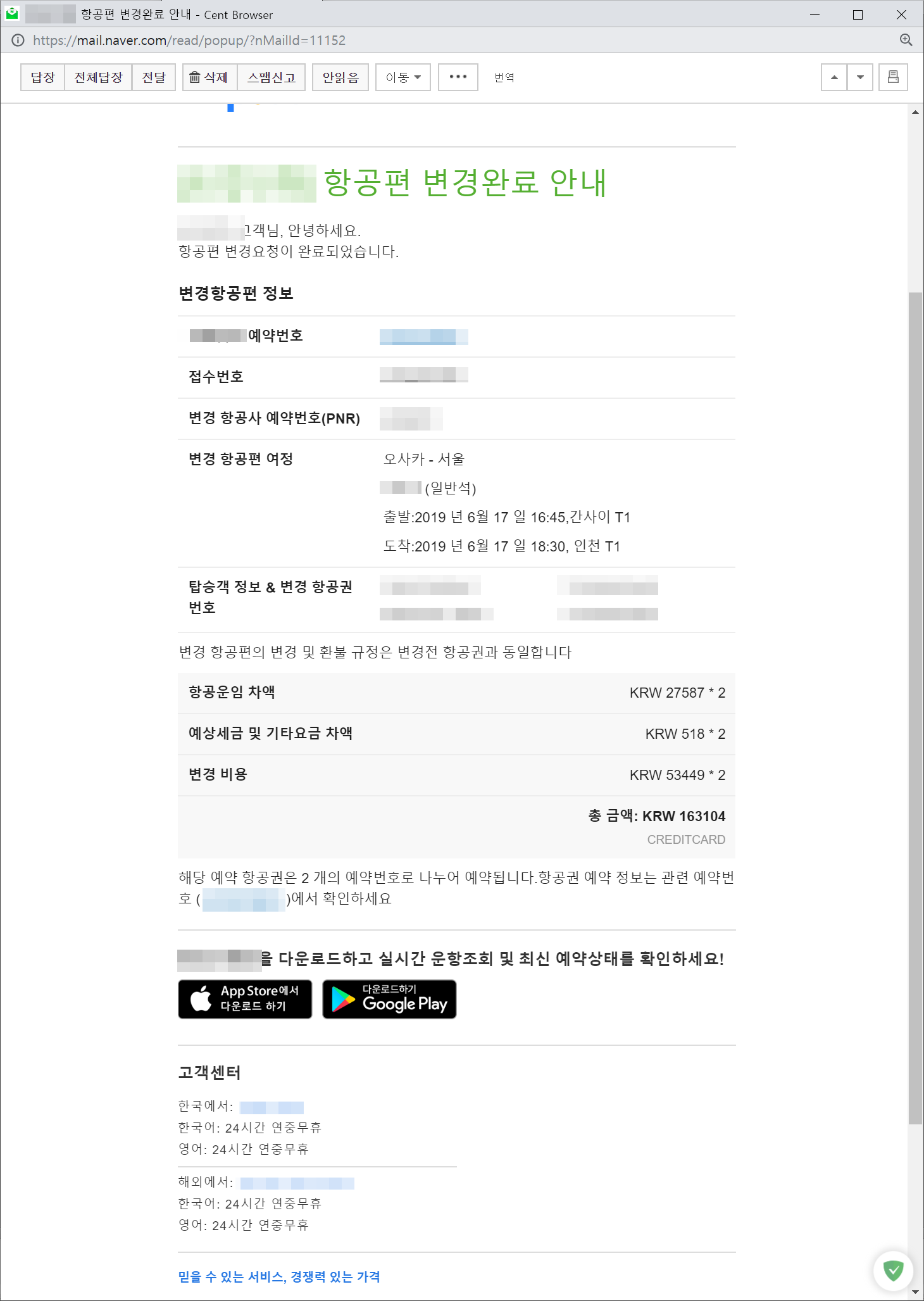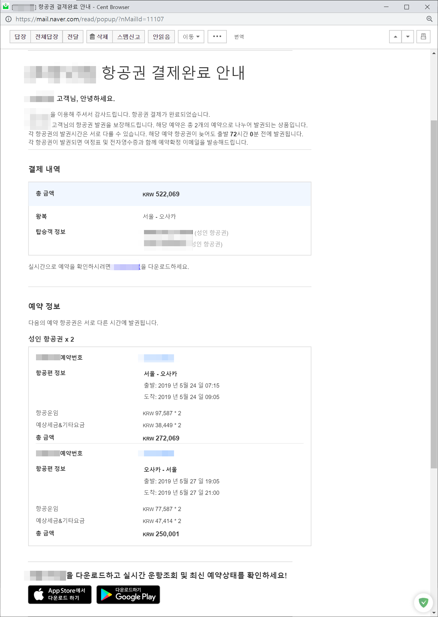 네이버에서 "오사카 항공권" 검색 후 저렴한 티켓으로 예약을 했고 결재를 했다.