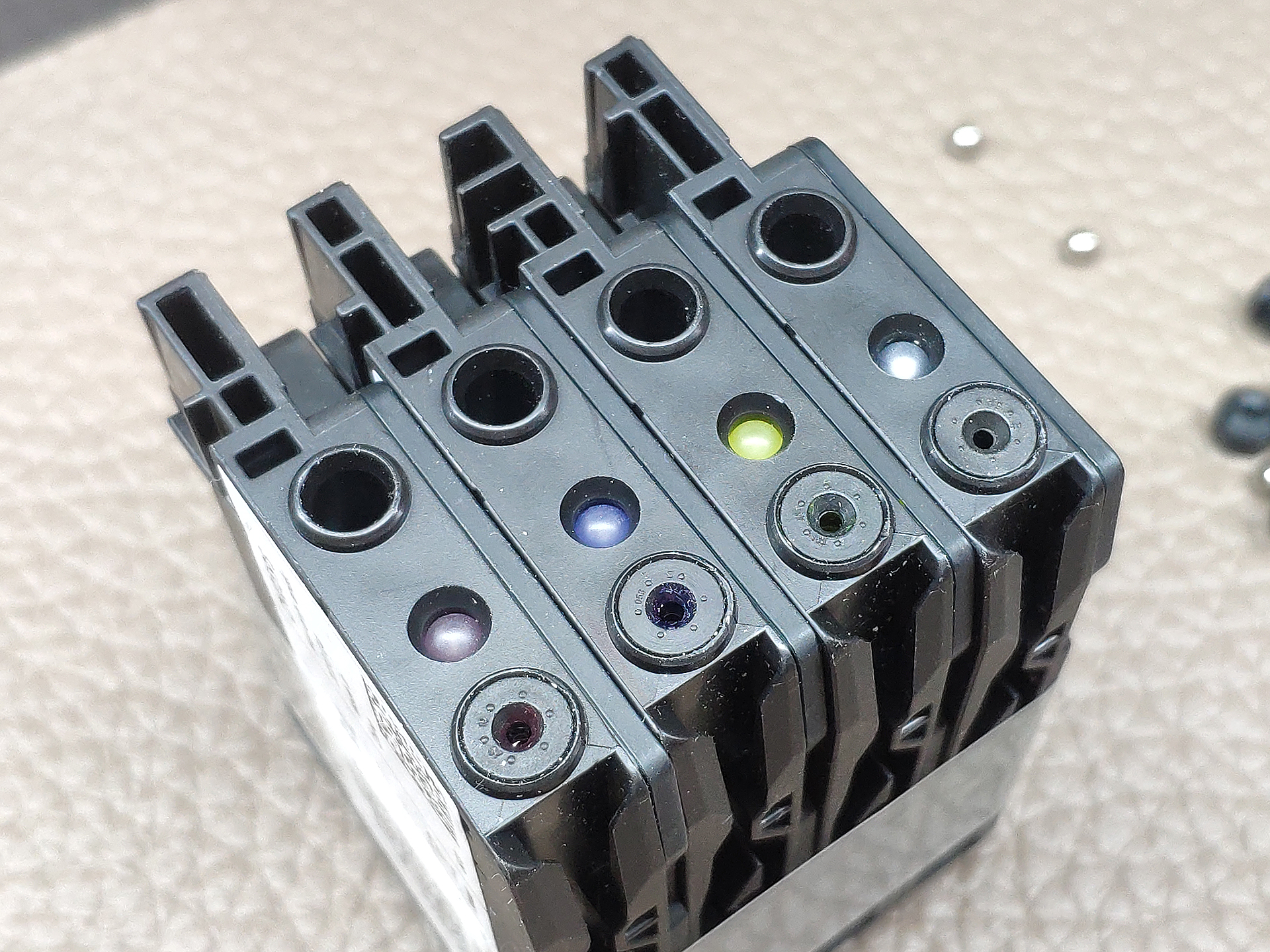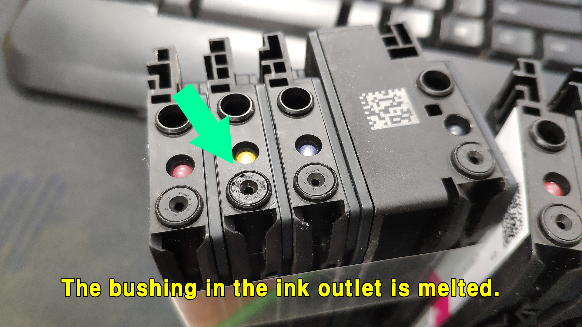 잉크 토출구을 막고 있는 고무 패킹이 시간이 지나면 녹아 내리는 현상이 생깁니다.