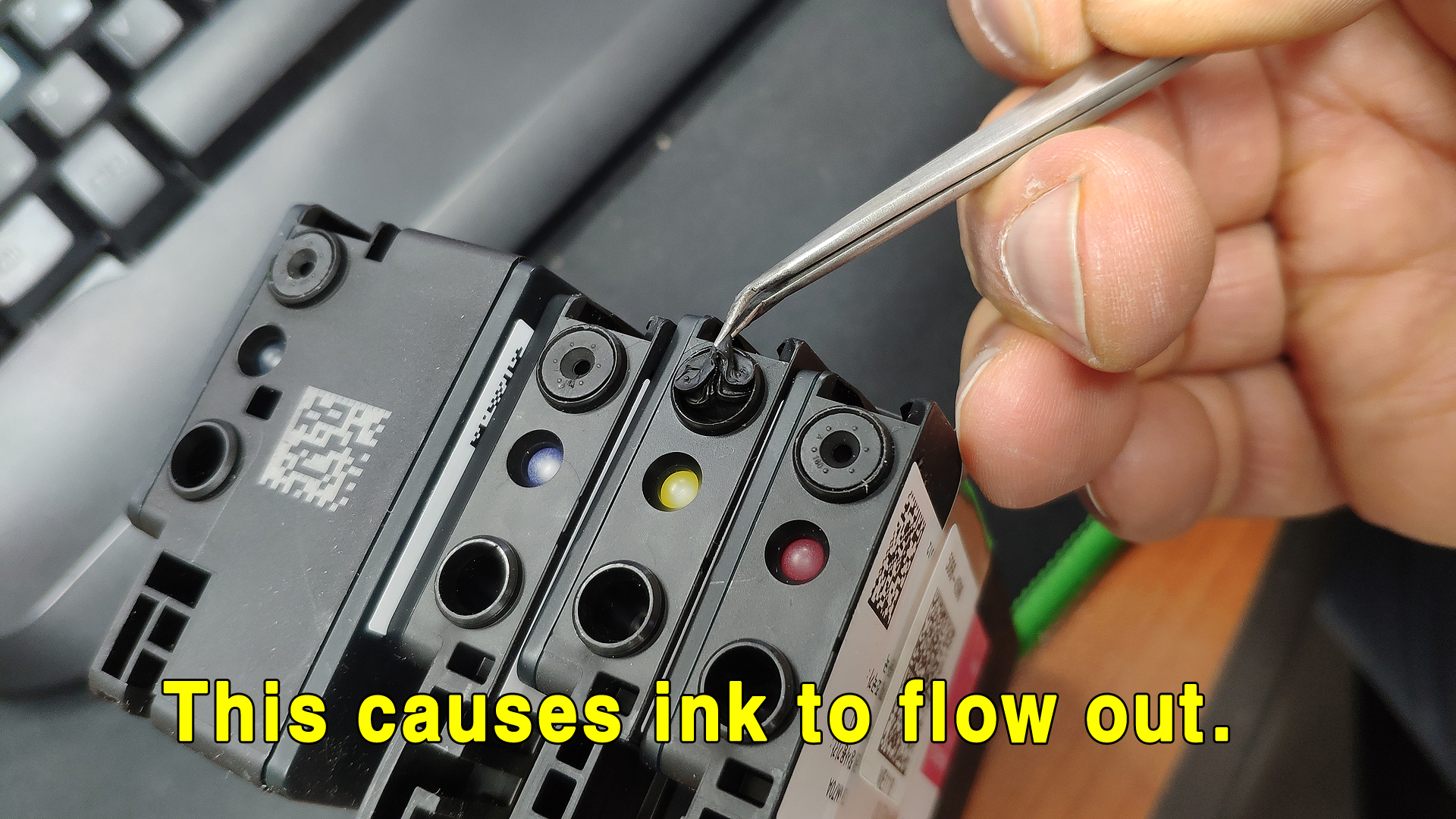 잉크 토출구을 막고 있는 고무 패킹이 시간이 지나면 녹아 내리는 현상이 생깁니다.