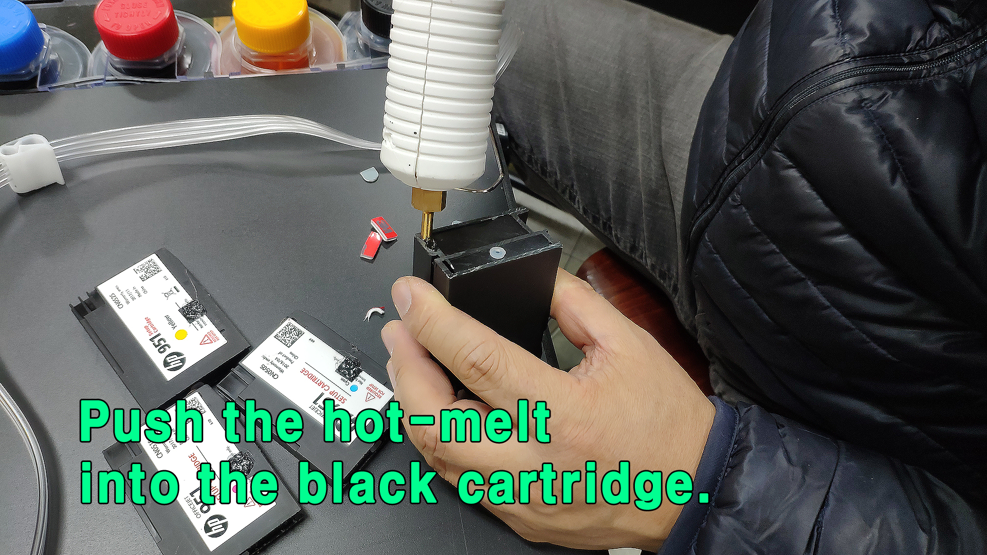 검정색 카트리지의 우측구멍에 핫멜트를 가득 쏴 줍니다.