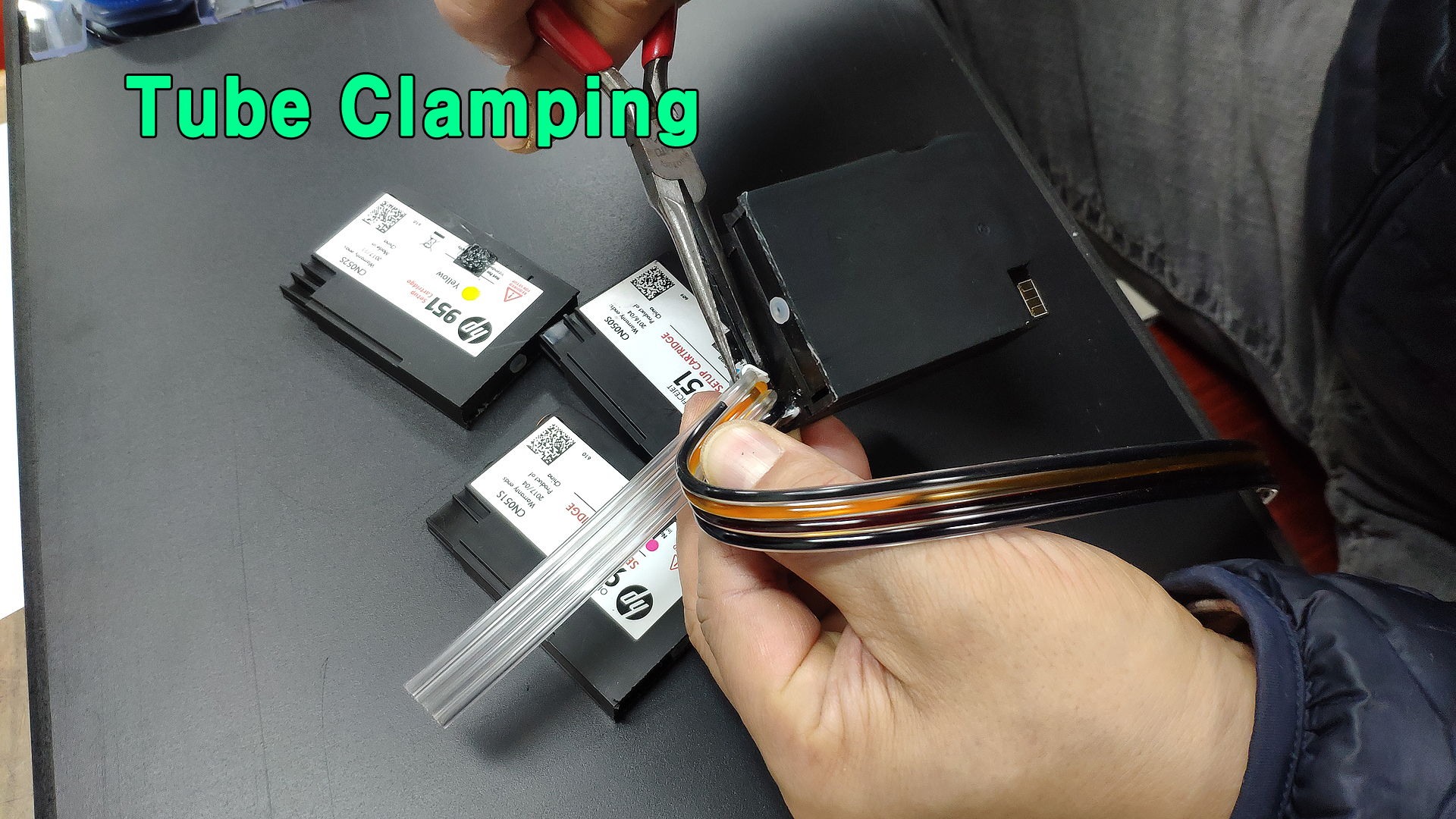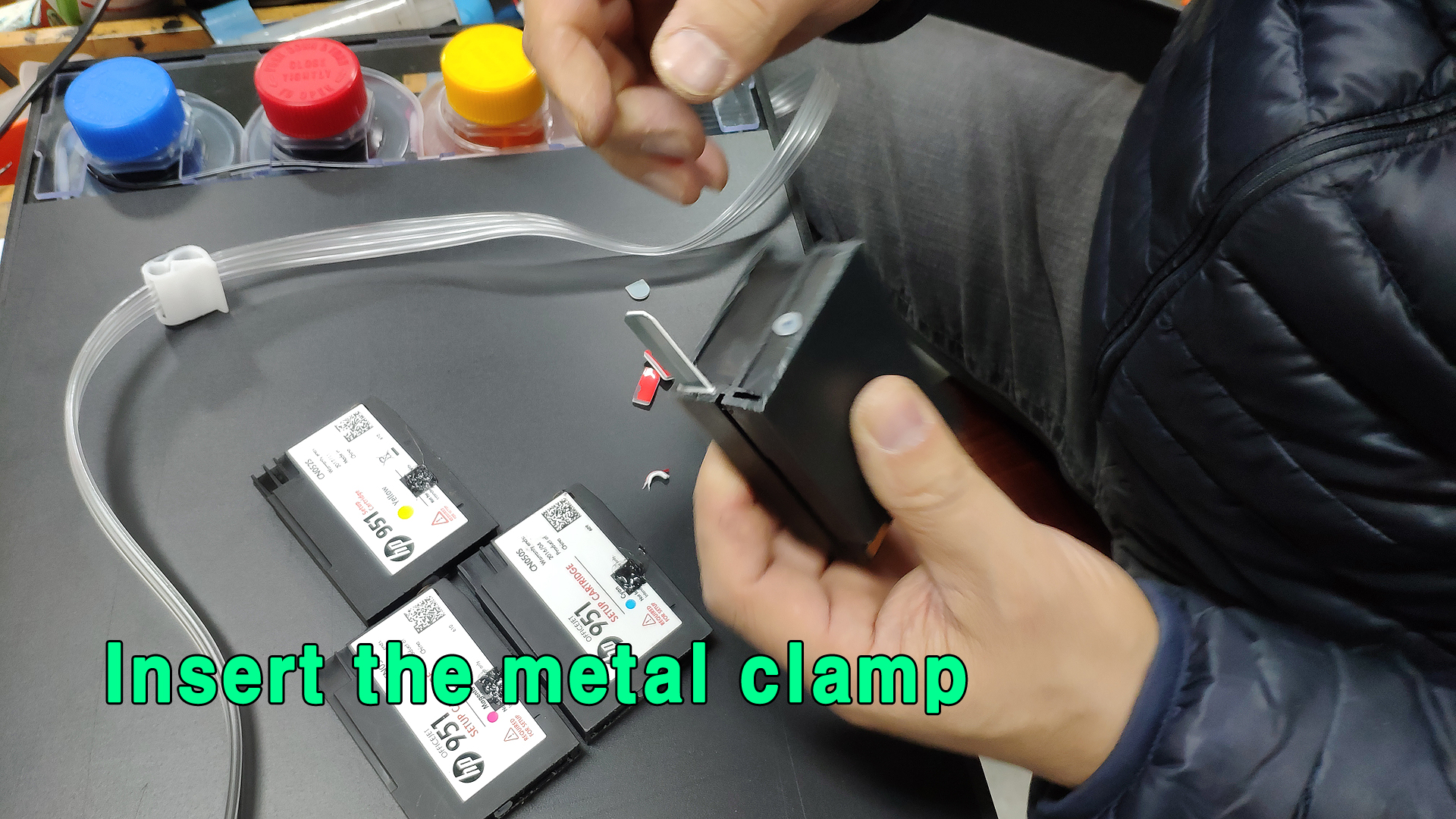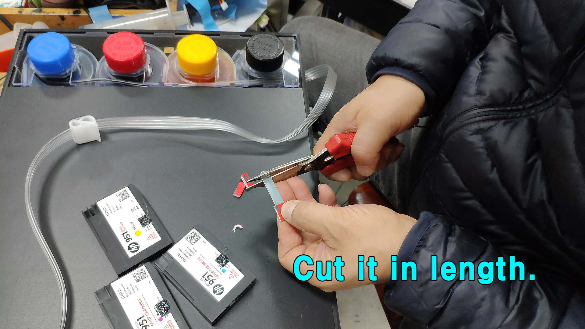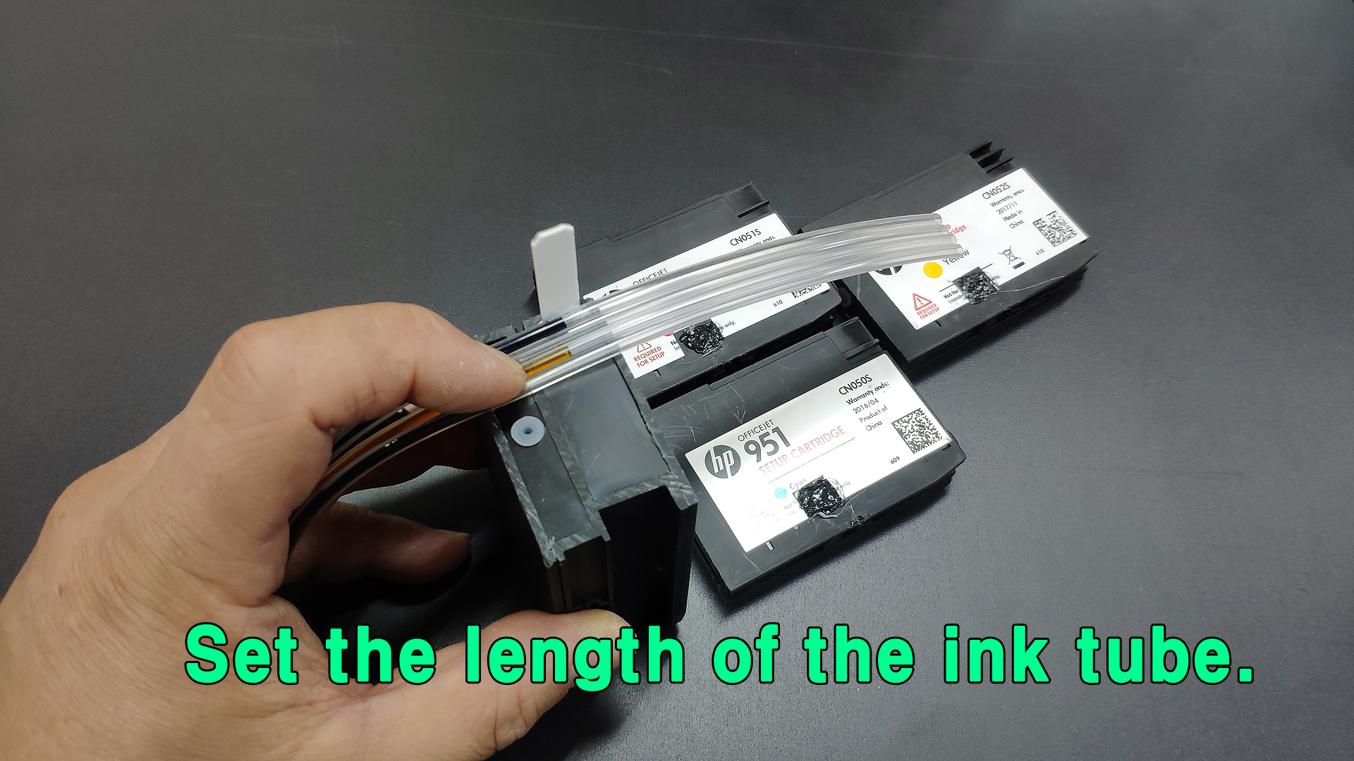잉크 튜브를 약 10센치 가량 길게 빼어서 자리를 잡습니다.