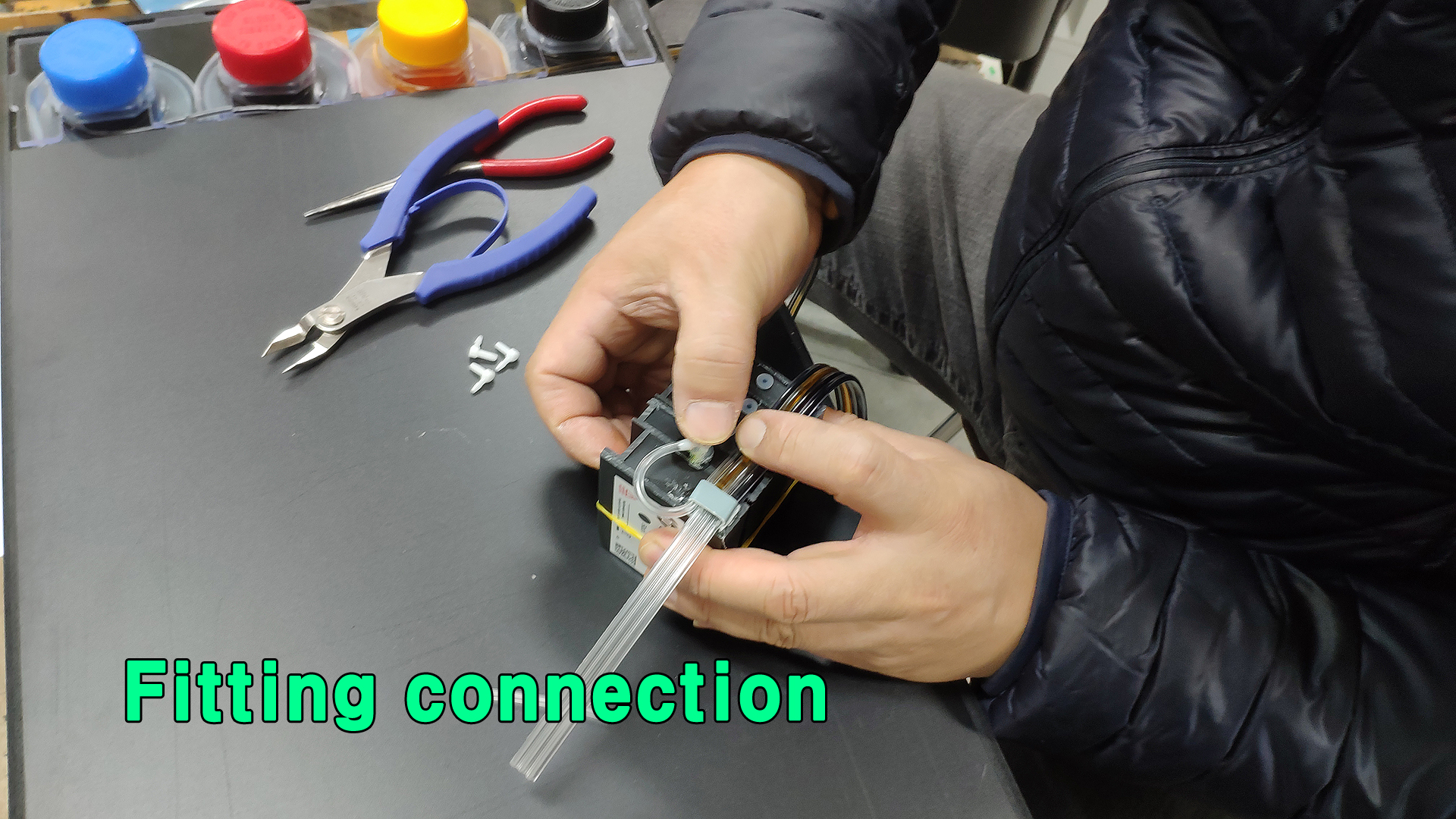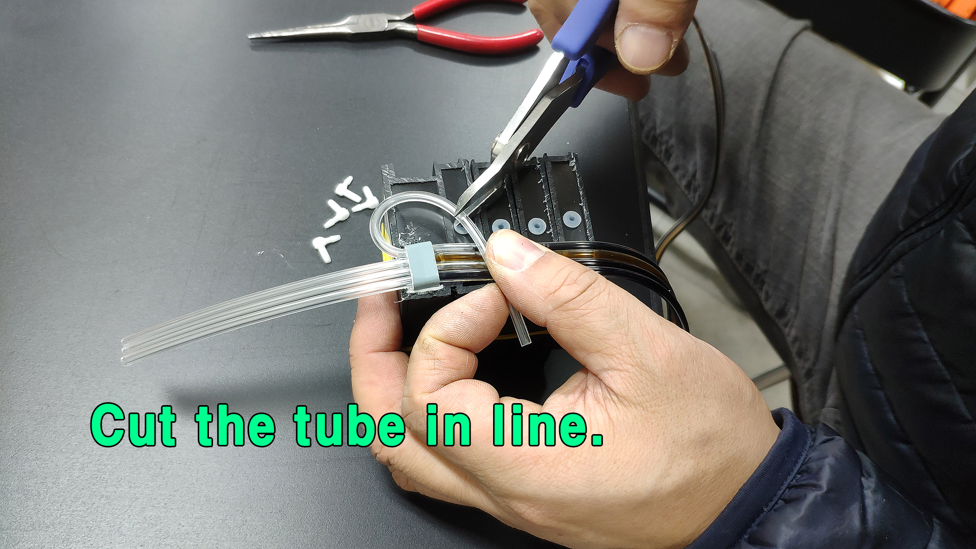 자른 튜브 끝에 피팅을 삽입하고 검정색 카트리지에 꼽아 줍니다.