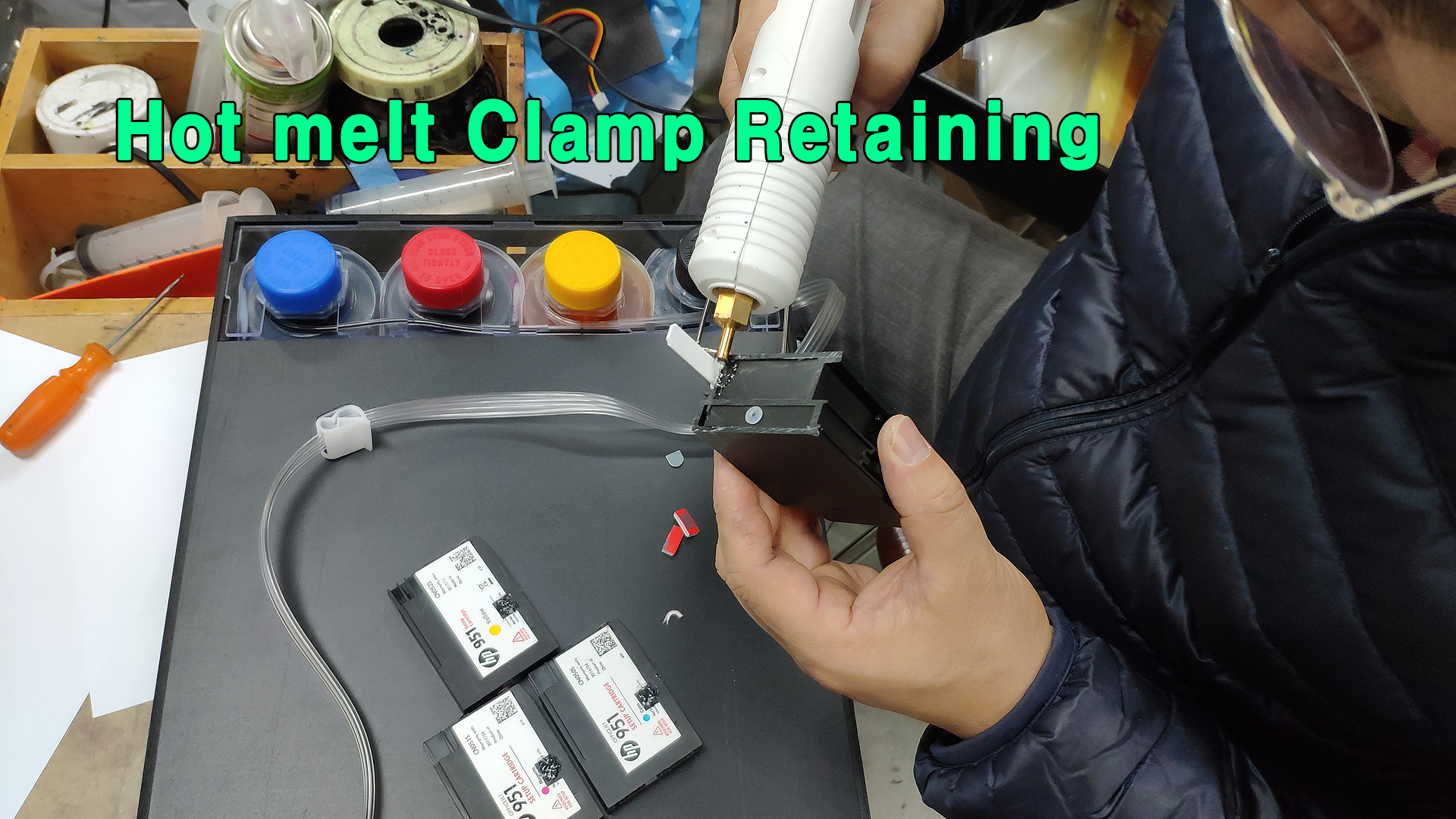 튜브를 고정하는 메탈 클램프를 핫멜트로 감싸줍니다.
