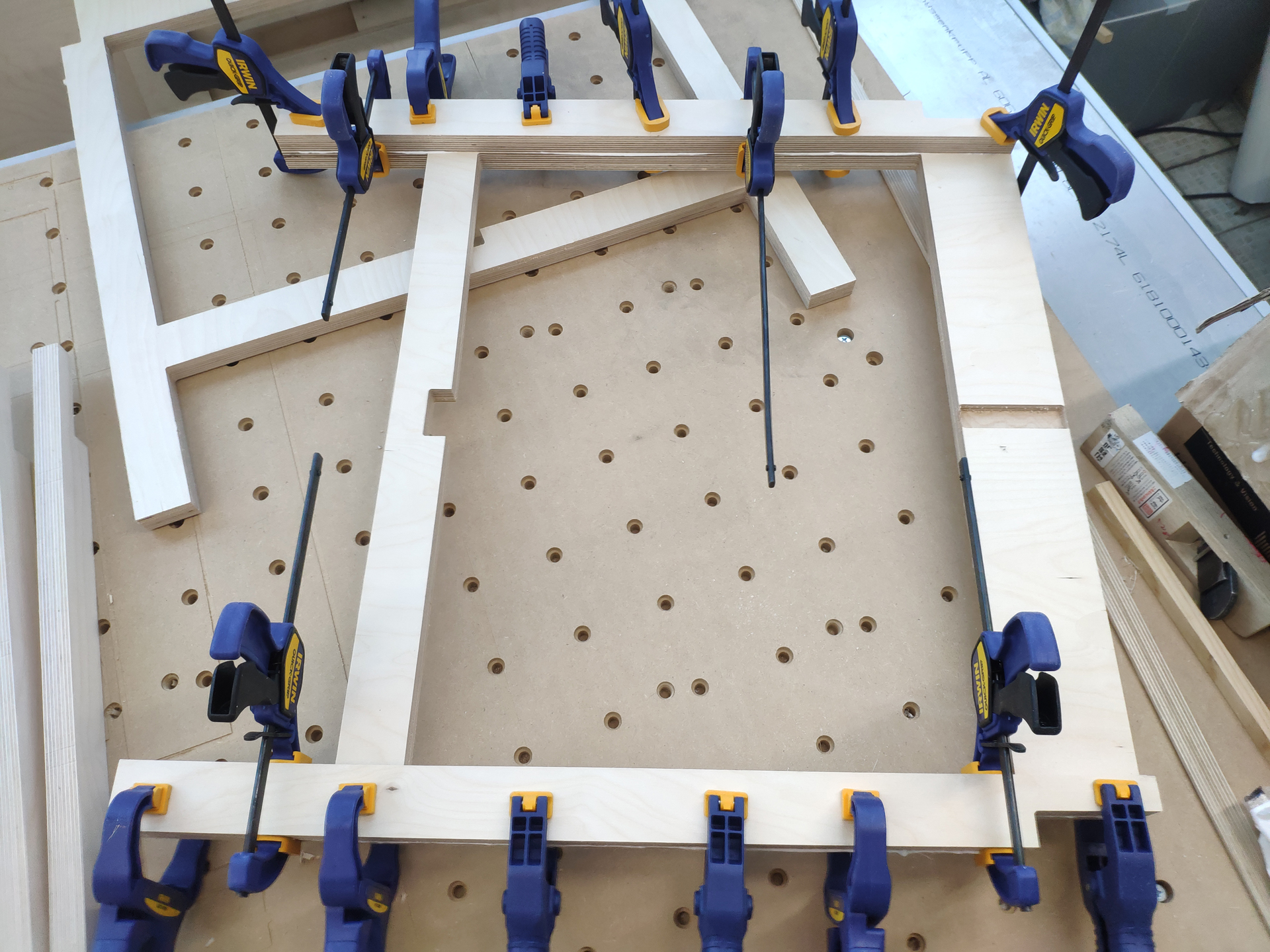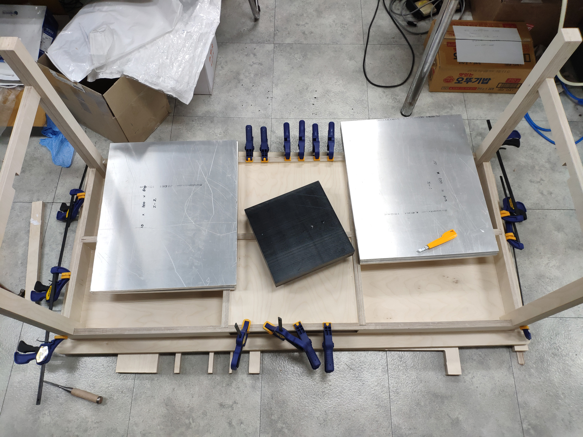 가운데 격벽 등은 무거운 알루미늄 판재를 올려서 본드가 굳는 동안 기다렸습니다.