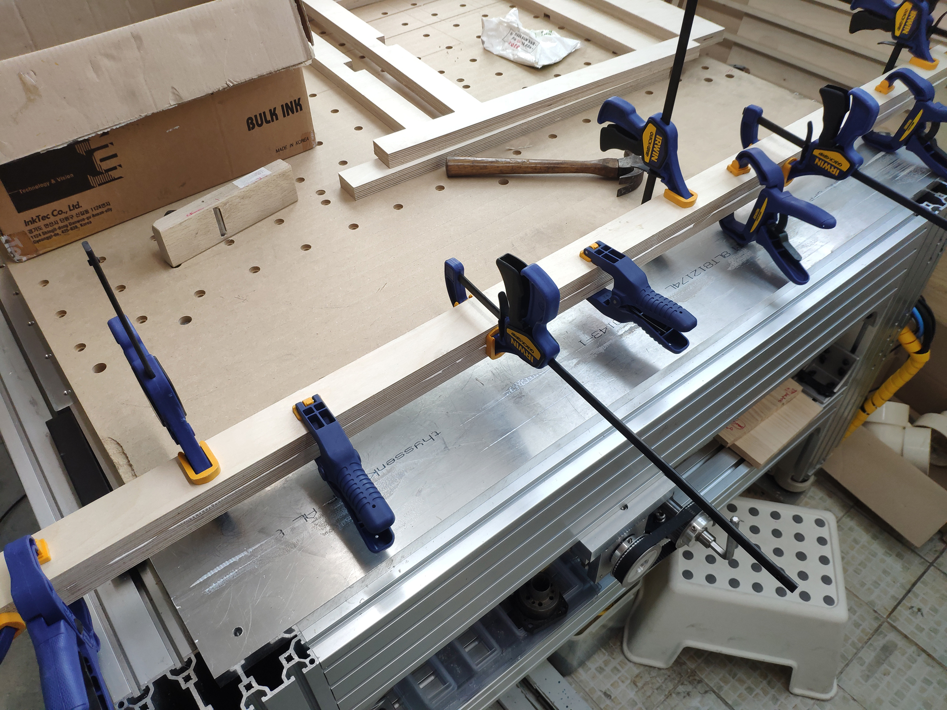 가운데 격벽 등은 무거운 알루미늄 판재를 올려서 본드가 굳는 동안 기다렸습니다.