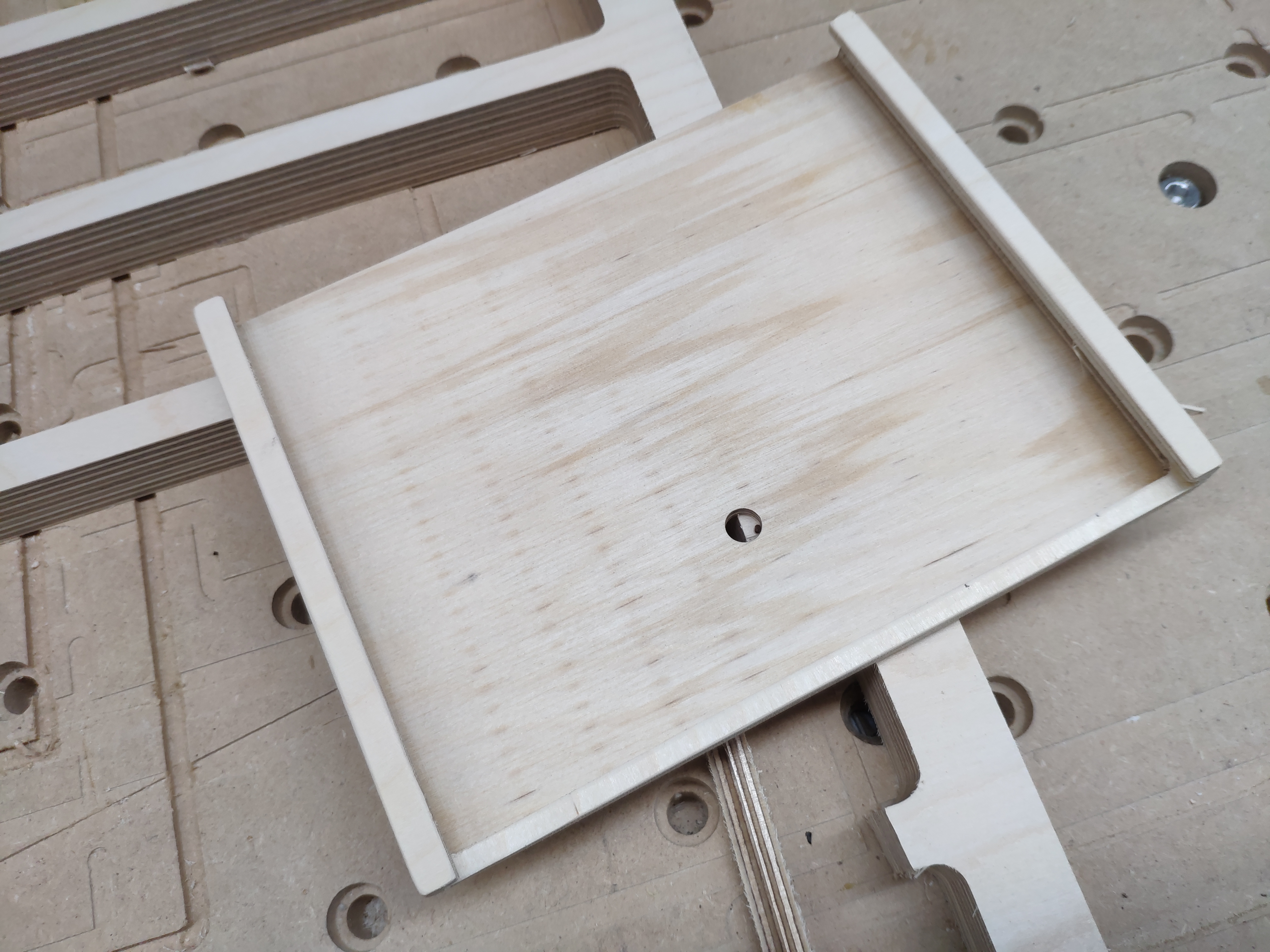 실측하여 10인치 태블릿에 맞게 자작나무 합판을 따 낸 후,