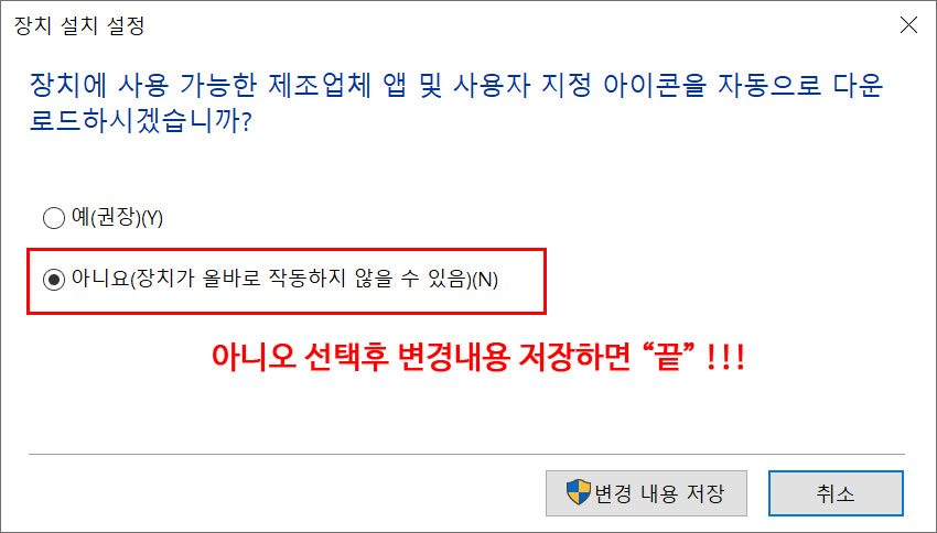 아니오 를 선택 후 변경 내용 저장을 누릅니다.