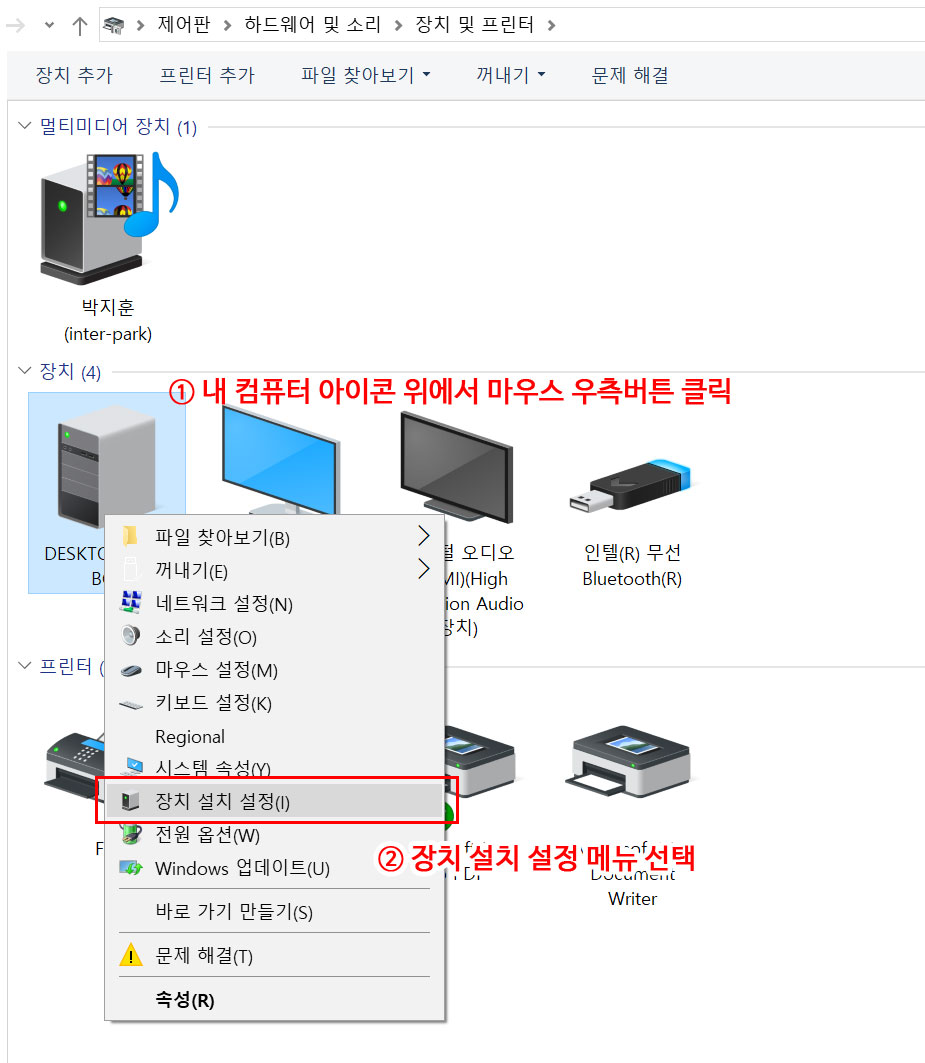 펼쳐진 팝업메뉴에서 장치 설치 설정 을 선택합니다.