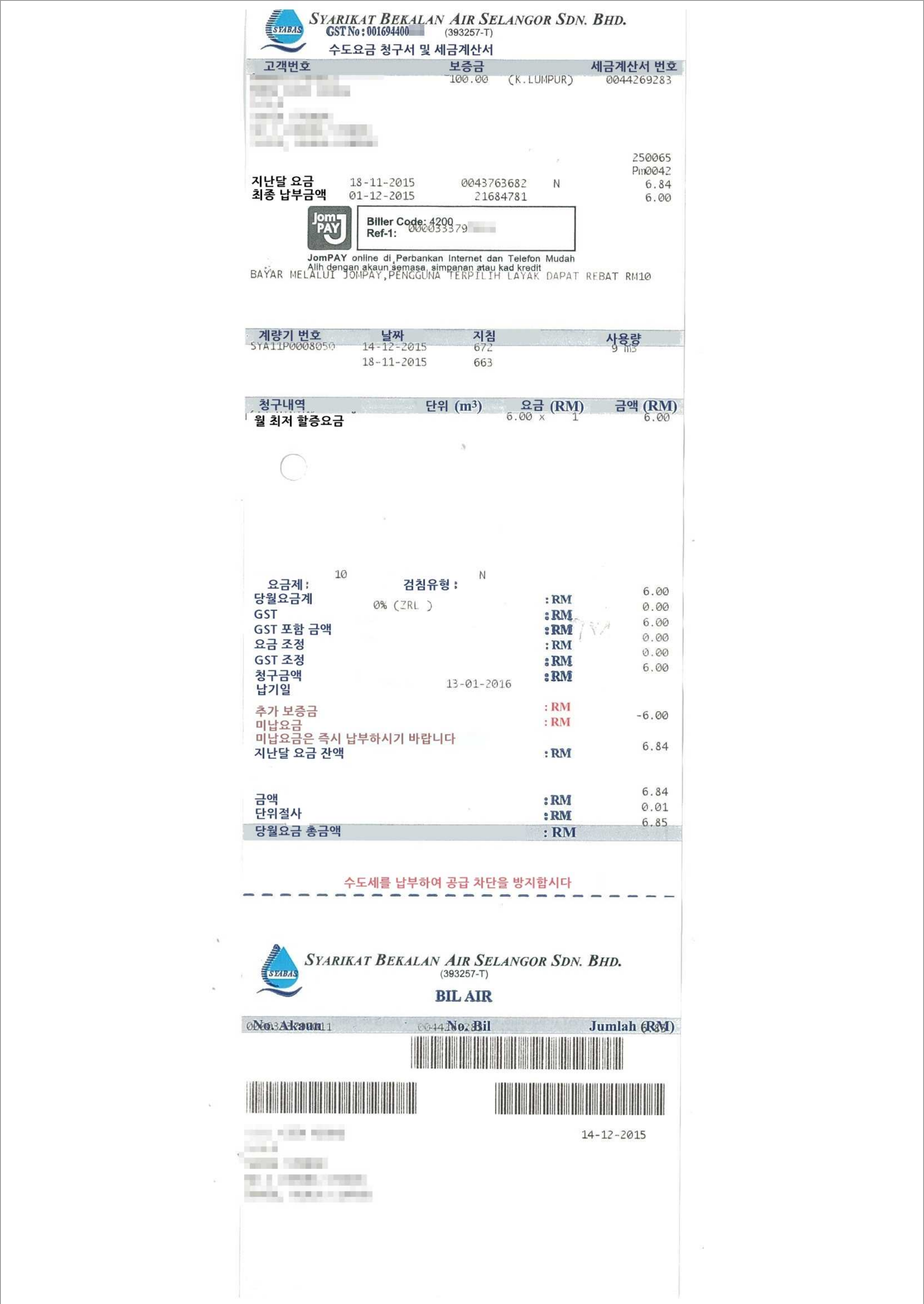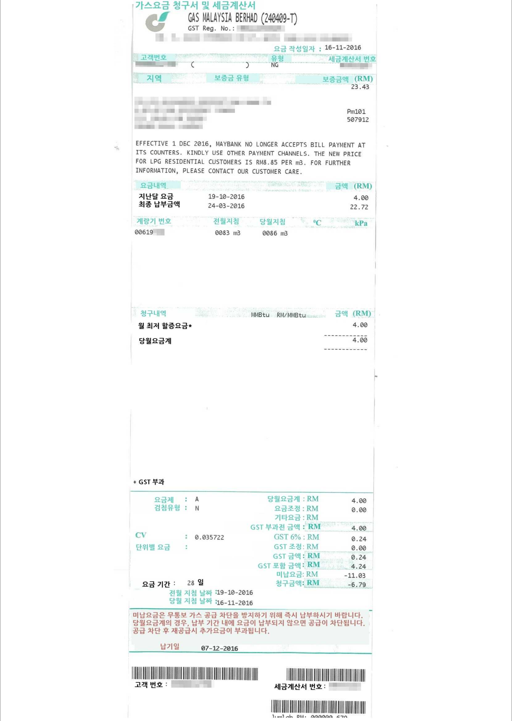 일상다반사/말레이시아 이야기 말레이시아 공과금 청구서 (말레이어 to 한글 번역본) by RichNam 2019. 9. 29. 반응형 - 전기요금(Tenaga Nasional) - 가스요금(Gas Malaysia) - 수도세(SYABAS) - 하수처리요금(Indah Water) 반응형 공유하기 게시글 관리 engram 저작자표시 (새창열림) 관련글 말레이시아 (말레이반도) 페낭 고해상도 지도 5730*6732 / 10MB 국제학교표기 버전 말레이시아 (말레이반도) 페낭 고해상도 지도 9,284*12,250 / 24MB 말레이시아 2019년 공휴일 안내 말레이시아 해외안전여행 정보
