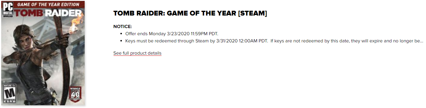 NOTICE:Offer ends Monday 3/23/2020 11:59PM PDTKeys must be redeemed through Steam by 3/31/2020 12:00AM PDT. If keys are not redeemed by this date, they will expire and no longer be usable.Limit 1 key per account.Tomb Raider is a critically acclaimed actio