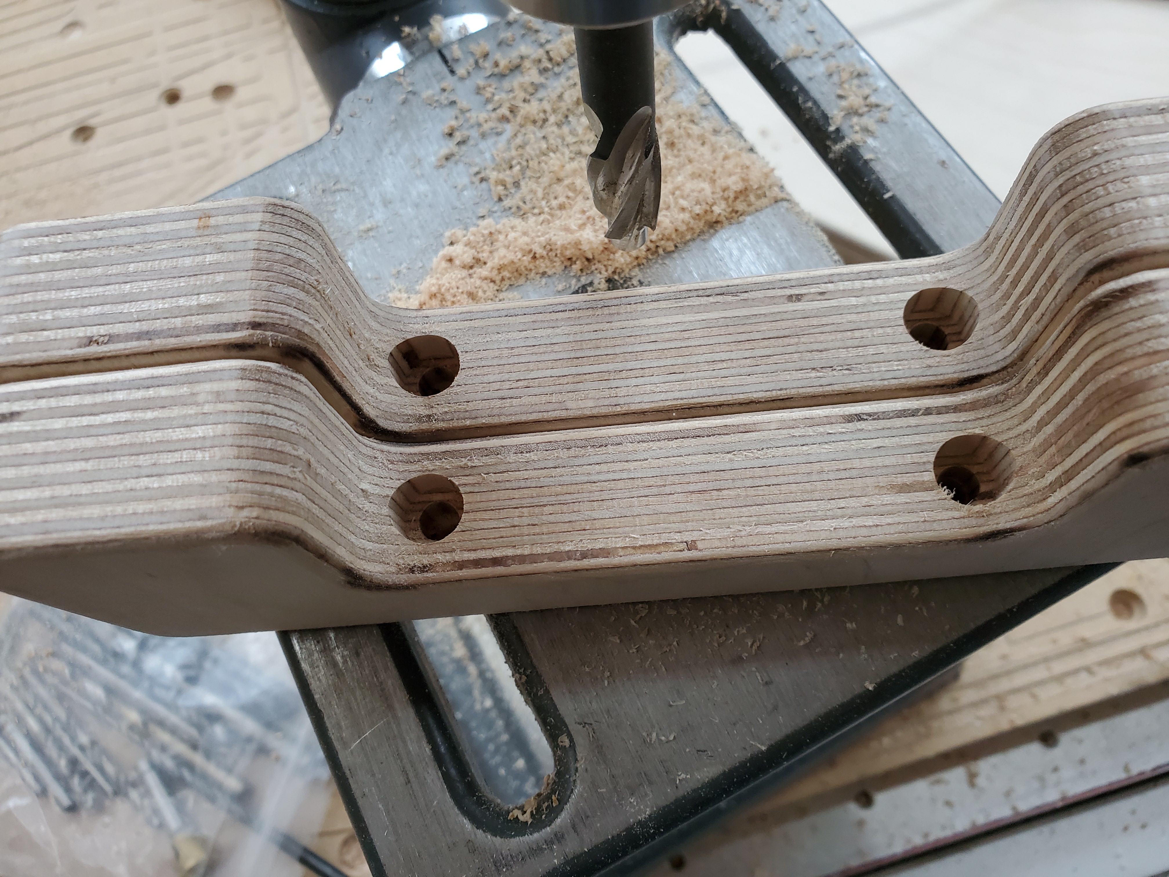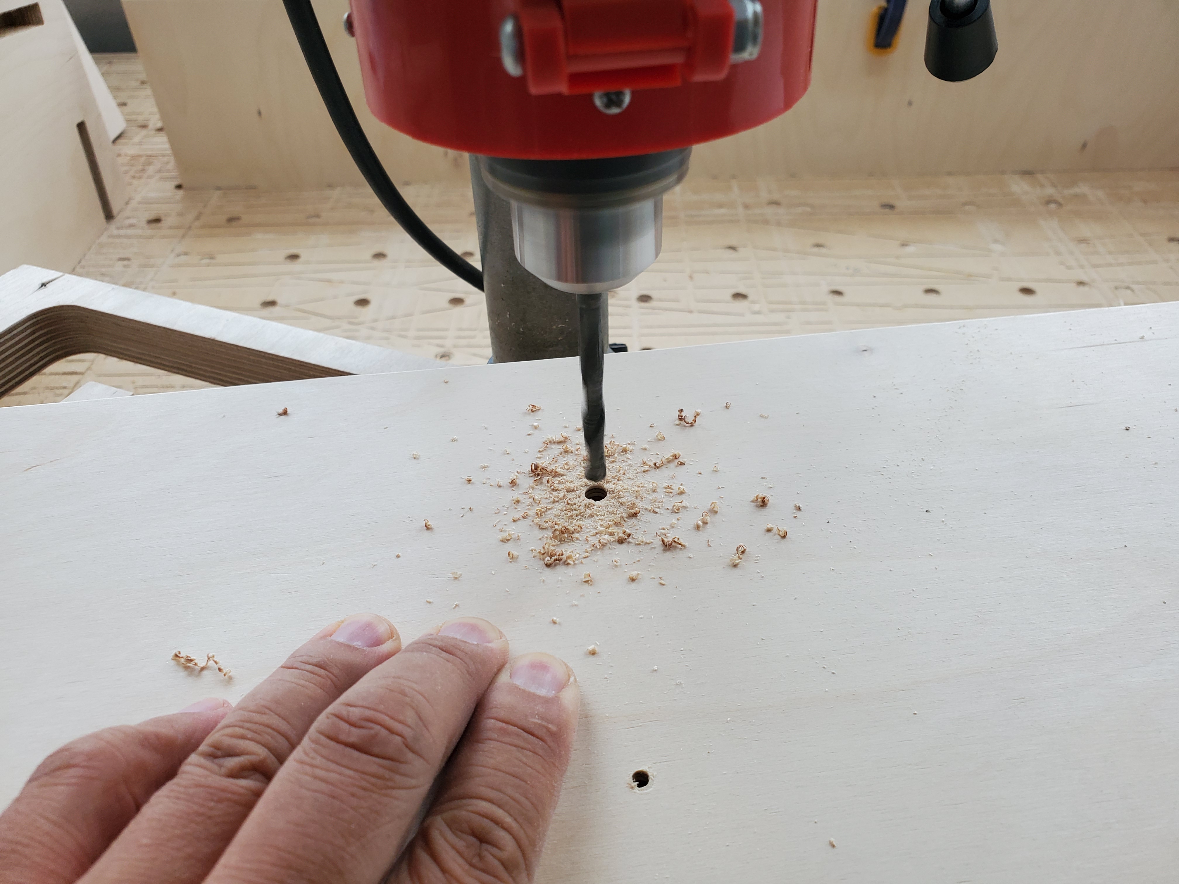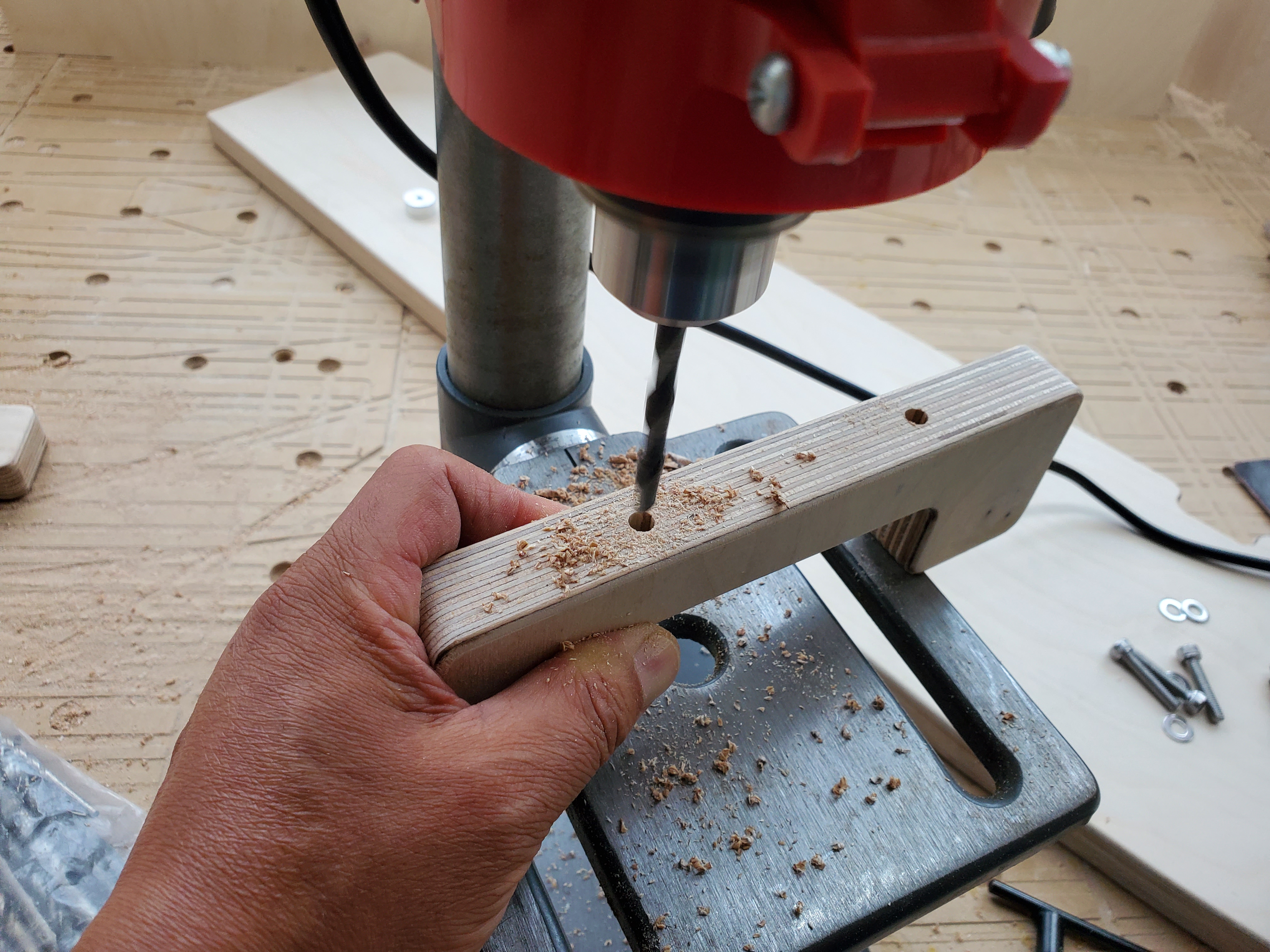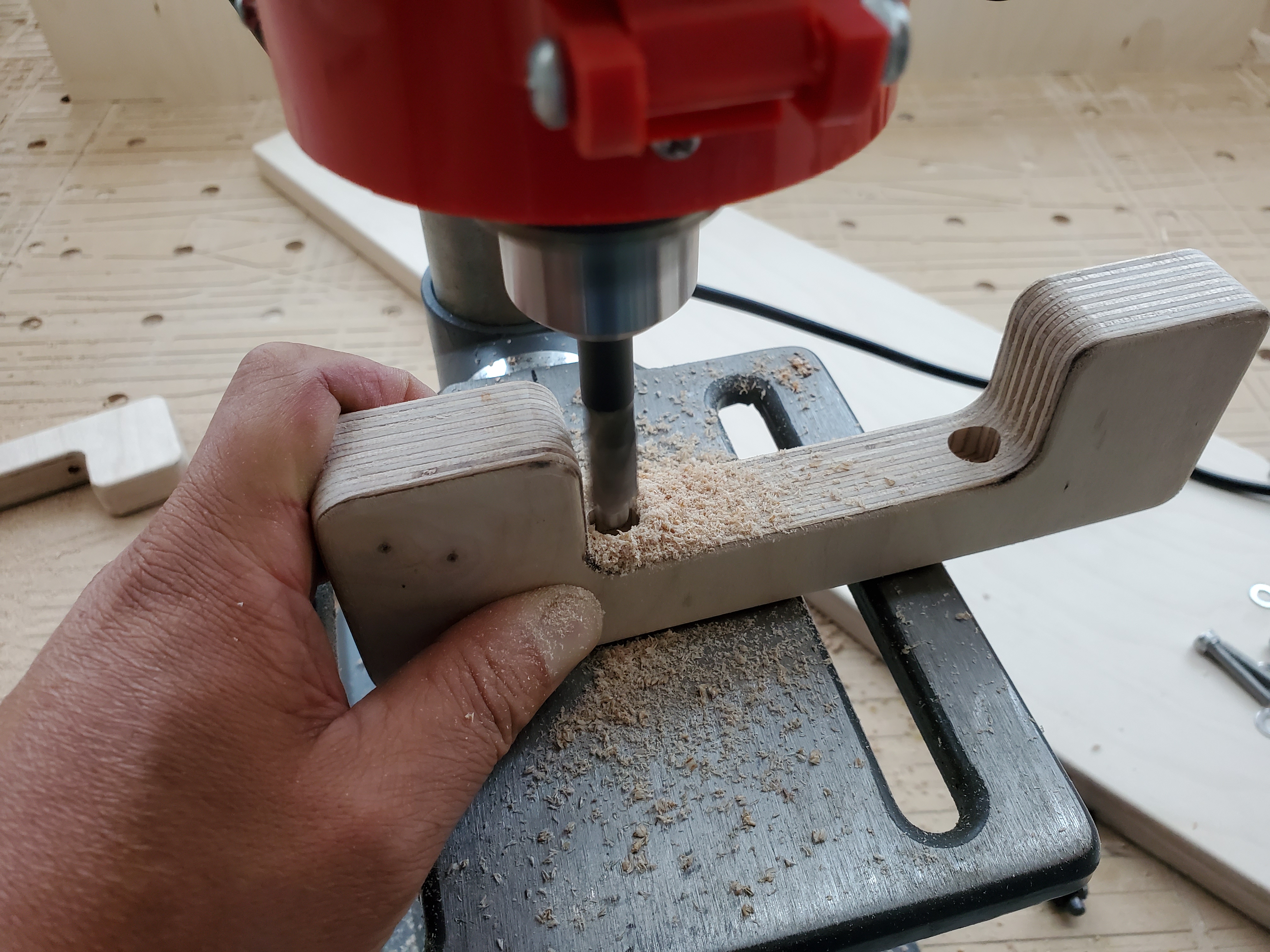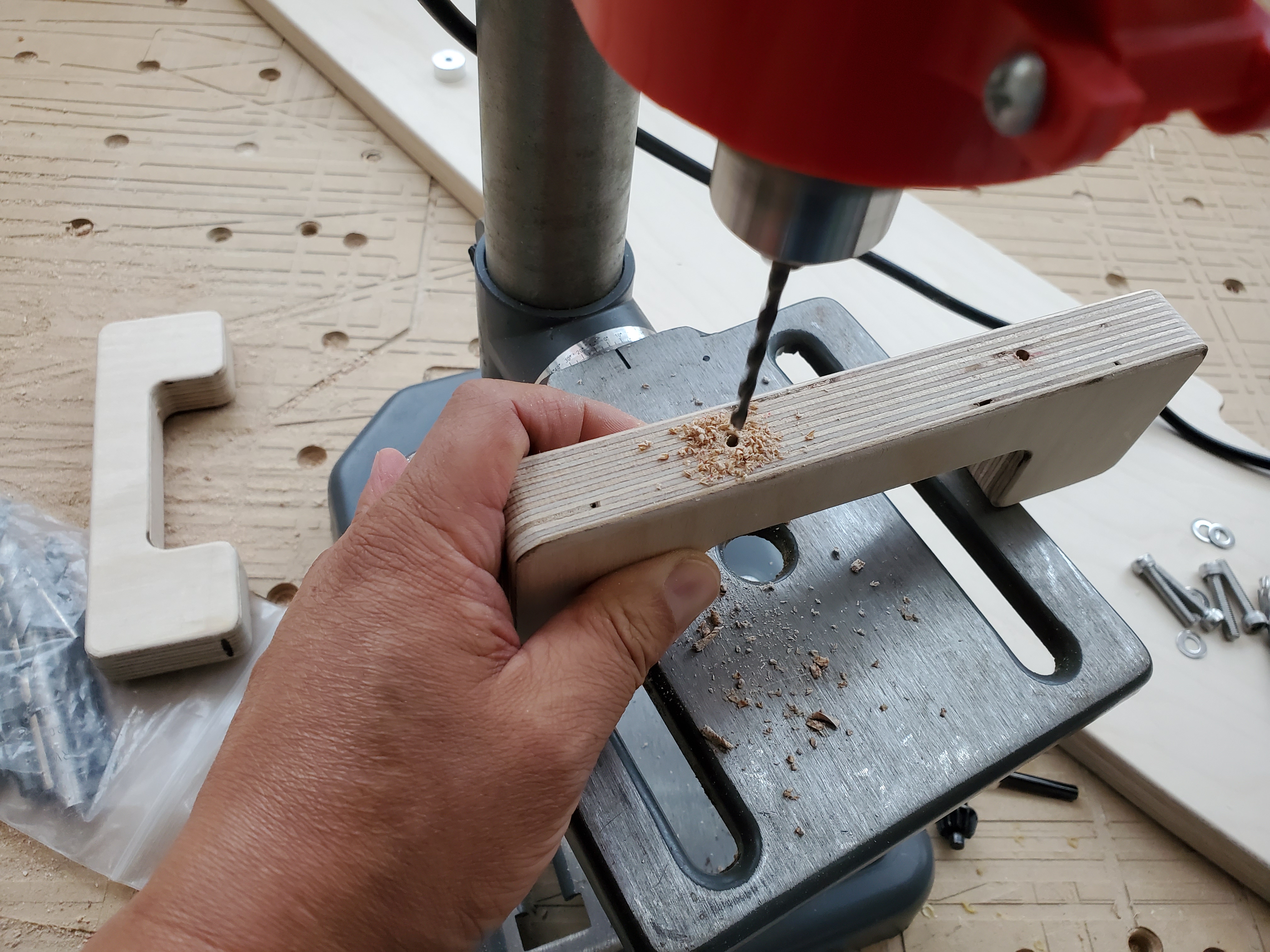 모니터거치대 상판의 번데기너트를 박을 구멍을 만들어 줍니다.