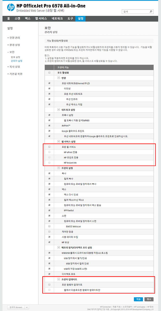 프린터 내부의 웹 서비스 기능 또한 비활성화 시켜두는게 좋을듯 싶습니다.