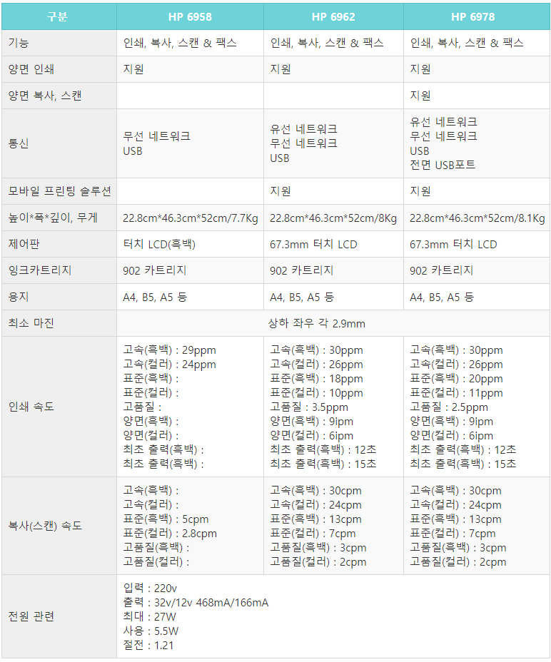 HP6958과 HP6962, 6978 모델별 차이점 보기 : 바로가기