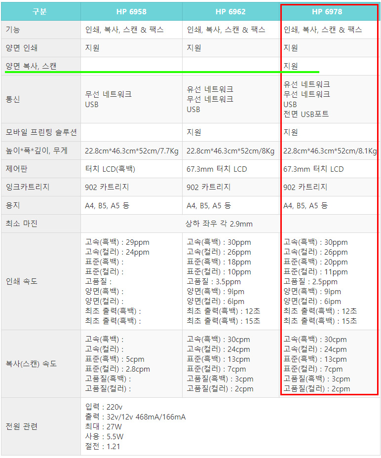 HP6958과 HP6962, 6978 모델별 차이점 보기 : 바로가기