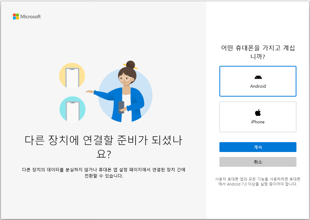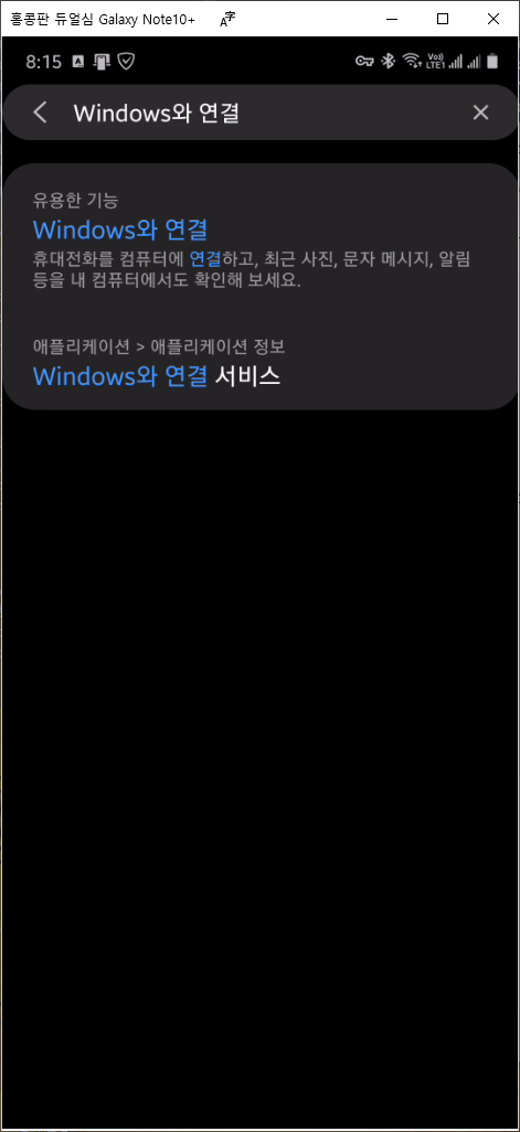 윈도우10과 휴대폰 과의 무선 연결입니다.