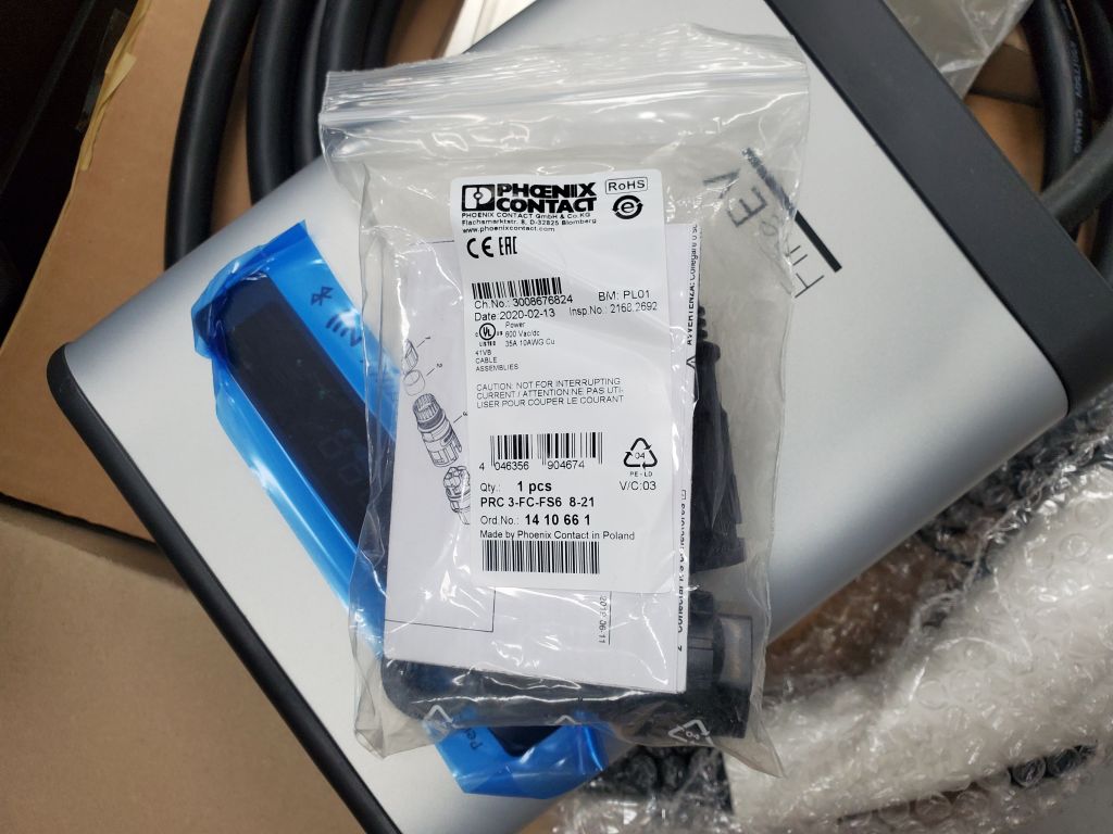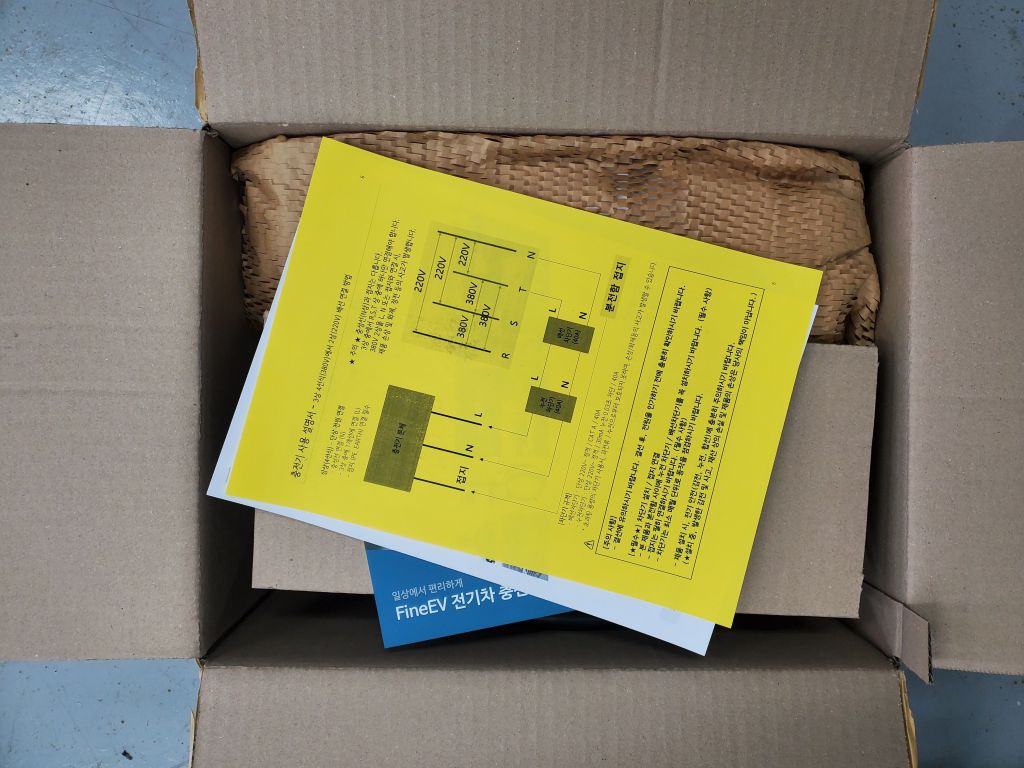 무지 택배박스에 완충재에 둘러 싸여 있을 충전기 본품과 충전 케이블.