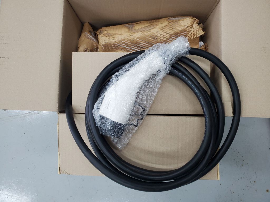 무지 택배박스에 완충재에 둘러 싸여 있을 충전기 본품과 충전 케이블.
