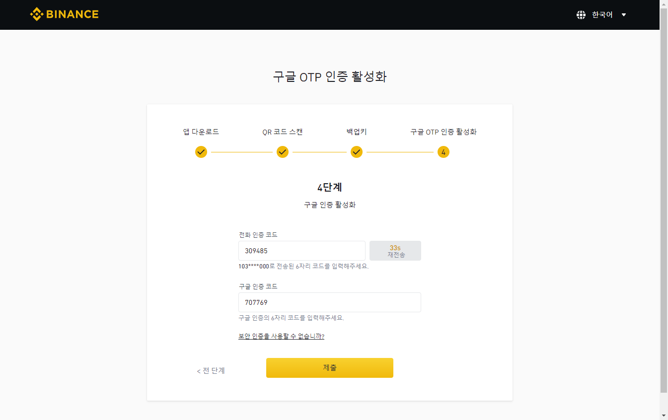 이 단계를 지나면 바이낸스 2차보안 설정이 끝났습니다.