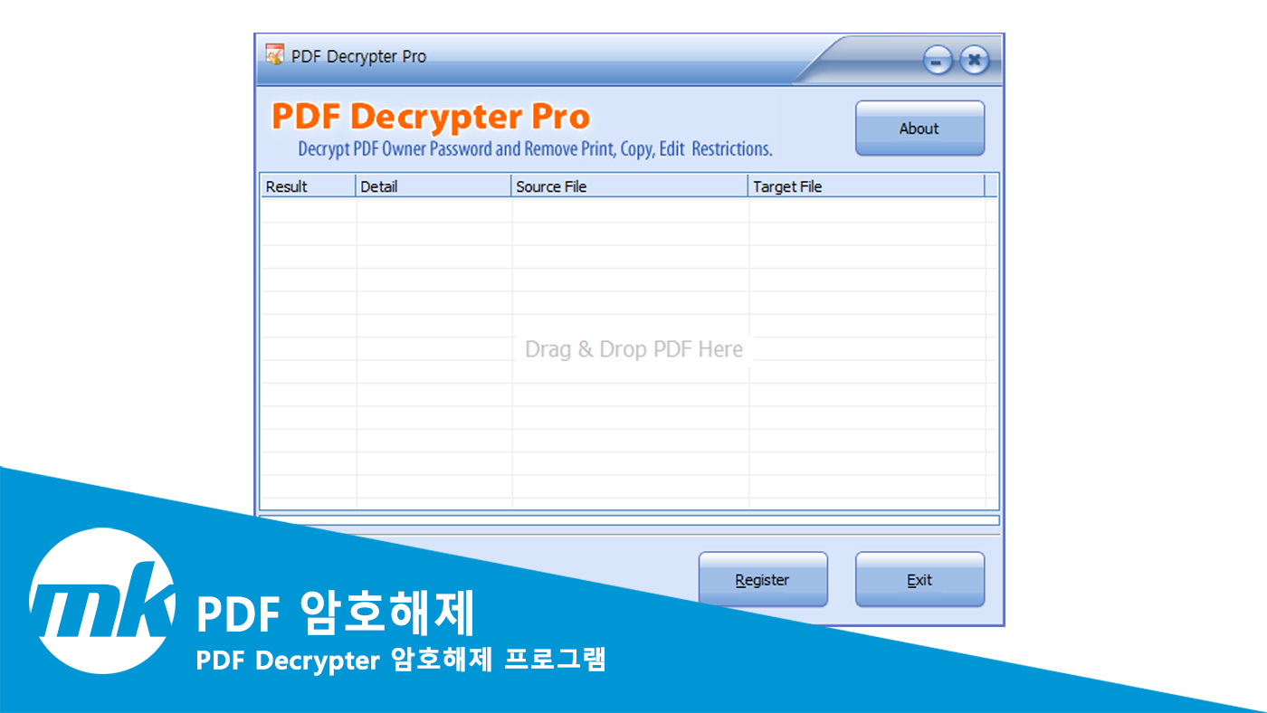 프로그램을 실행한 후에 암호 해제를 할 PDF 문서를 PDF Decrypter 프로그램에 드래그 & 드롭해 주시면 됩니다.