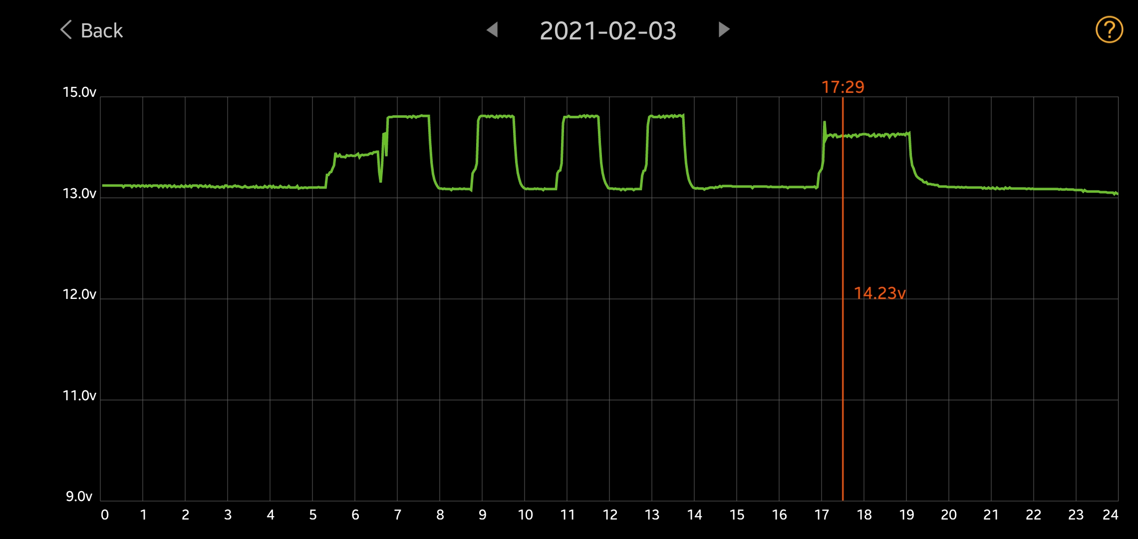 약 2시간 가까이 14.23v 대를 유지하며 충전을 하고 있음을 알 수 있네요.