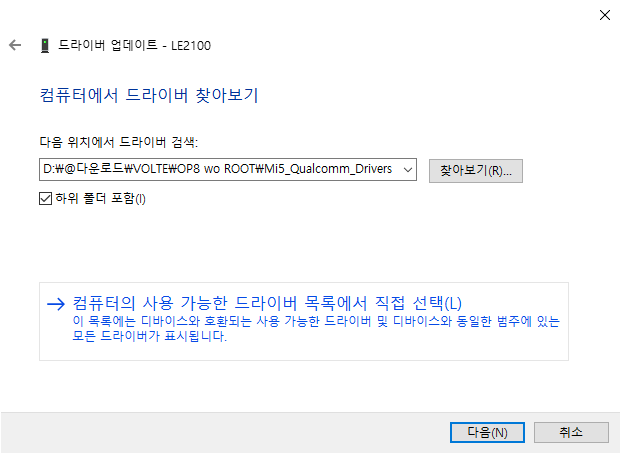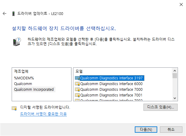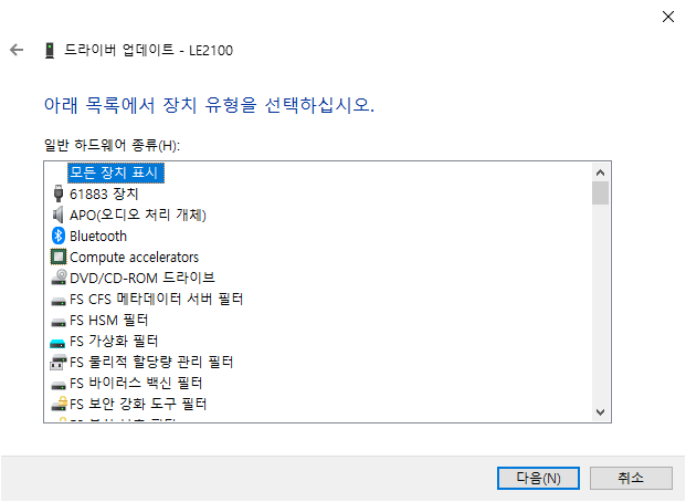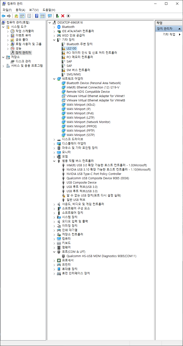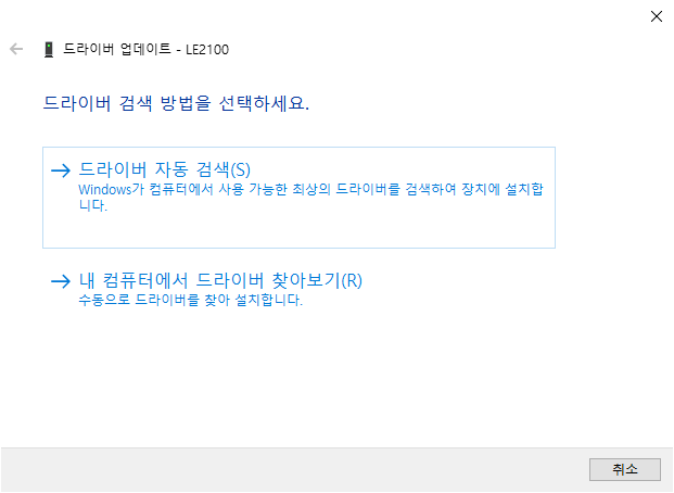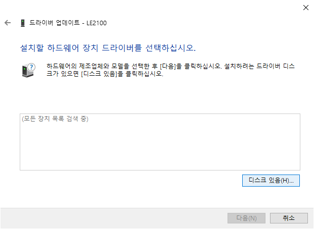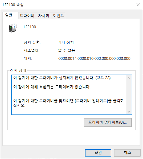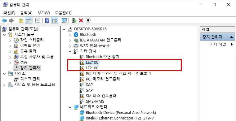 그러면 장치 관리자에 LE2100 이 다시 드라이버가 없는 상태로 뜨거나 하나만 없다고 뜨게 되는데