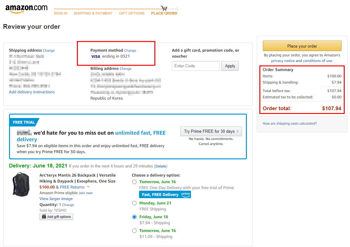 결제창 Payment Method 에서 Change를 눌러 들어갑니다.