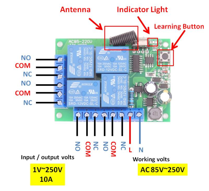 - 1. 순간 모드: "A" 버튼을 길게 누르면 릴레이가 켜집니다. 버튼을 놓으면 이 릴레이가 꺼집니다.