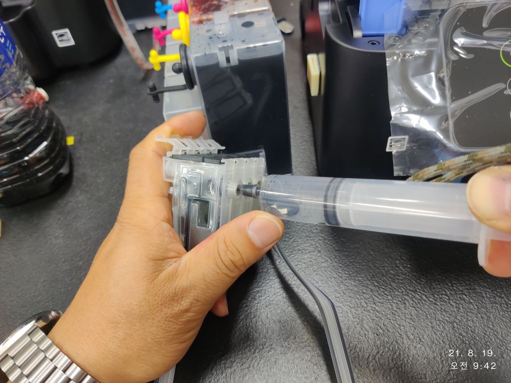석션하는 방법은 카트리지를 뒤집어 잉크 토출구에 선션 주사기 등을 꼽고