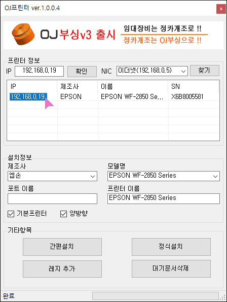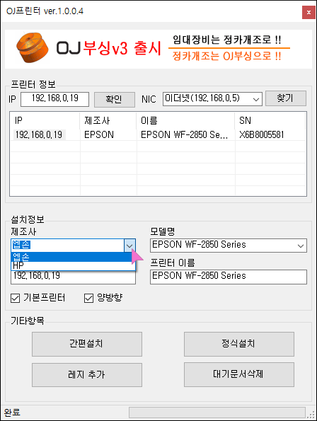 제가 설치하려는 WF2850 프린터는 19번 IP가 맞기에