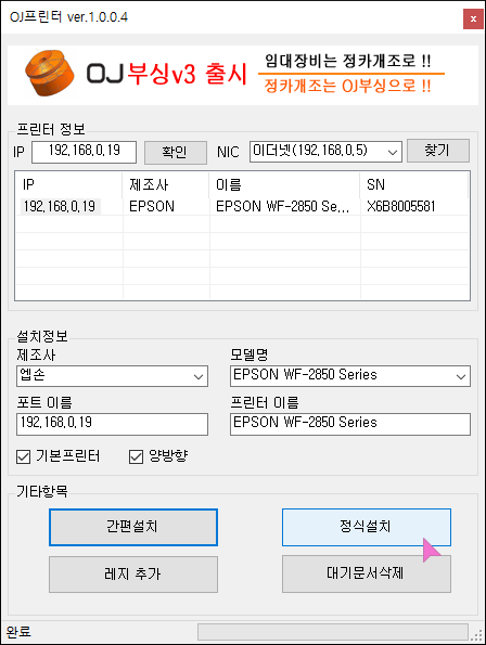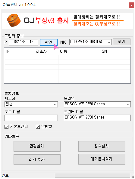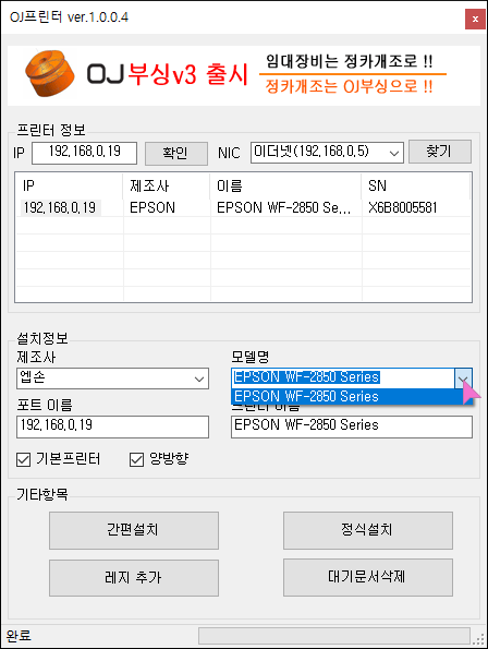 제가 설치하려는 WF2850 프린터는 19번 IP가 맞기에