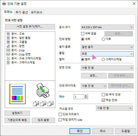 시중에 저렴히 판매되는 A4용지를 구입하여 표준모드 와 고품질 모드 두가지로 출력하여