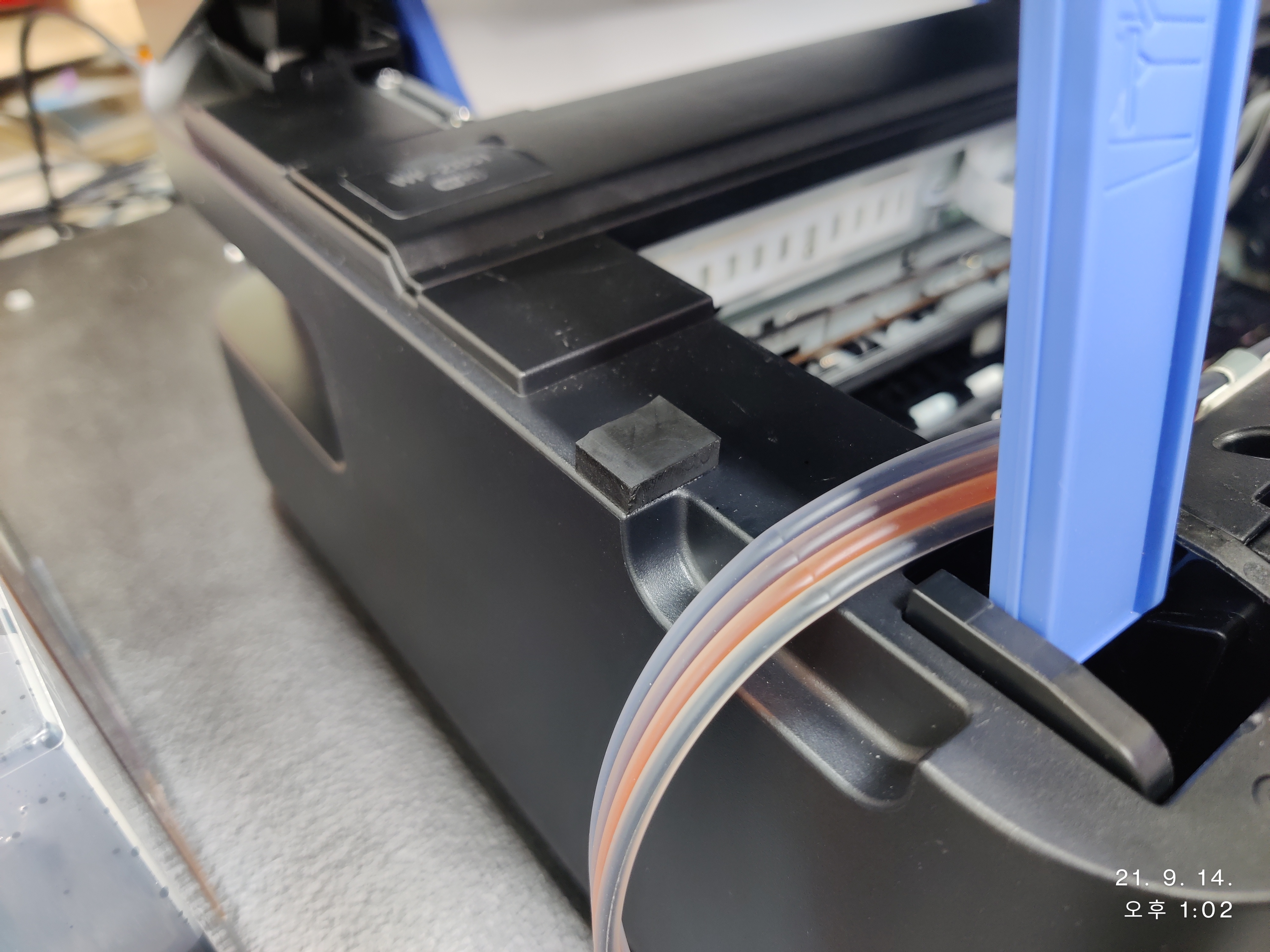 아래 사진처럼 상판이 잉크호스를 누르지 않게 받쳐 주면 됩니다.