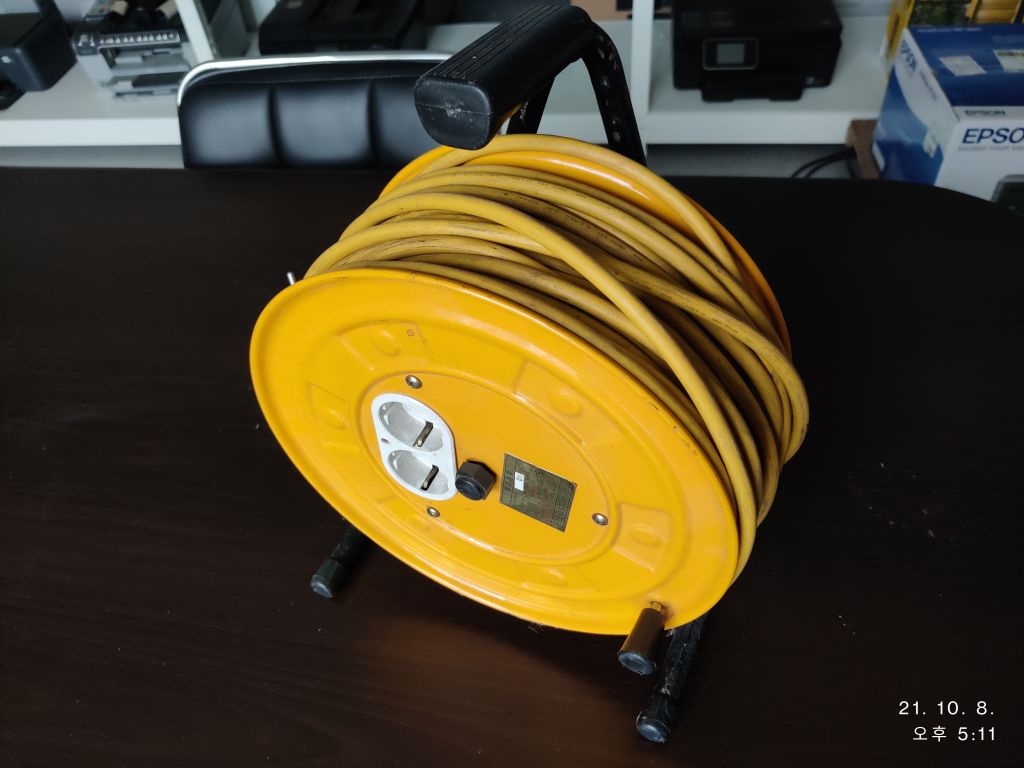 아래 콘센트를 연결하여 15m 길이로 사용하던 가장 일반적인 형태의 전기 연장선이었습니다.