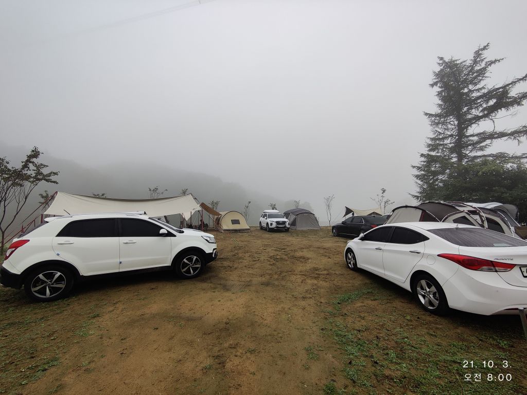 텐트를 비롯 타프 자동차가 이슬을 가득 머금고 있어요.