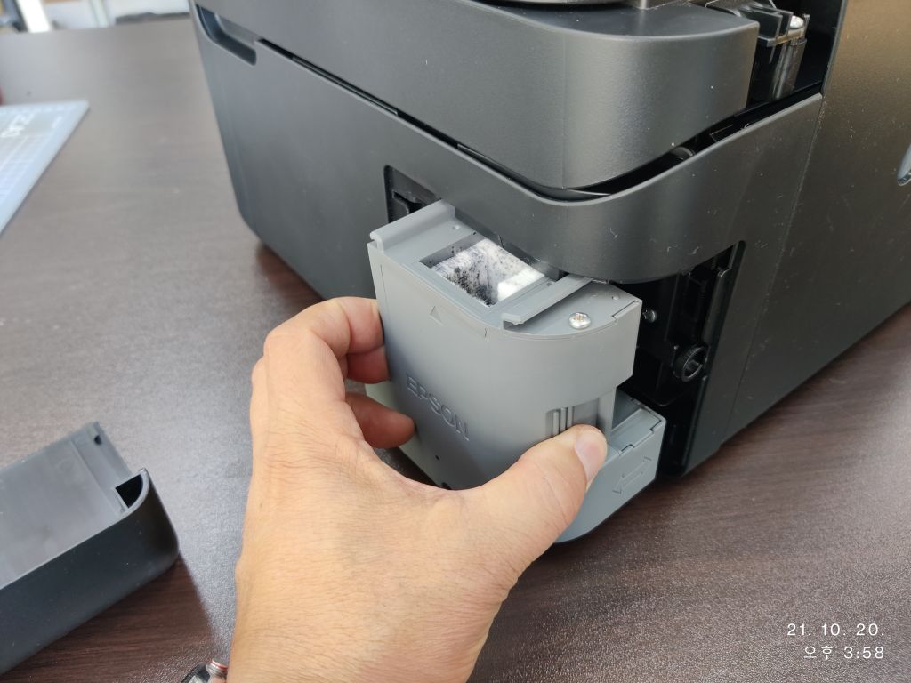 엡손 WF 2860 / 2861 프린터의 폐잉크통, 즉 유지보수상자가 폐잉크로 인해 가득 찼을 때 교체하는 방법입니다.