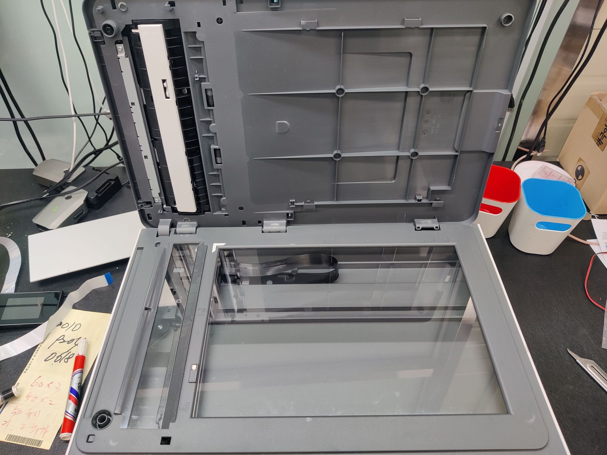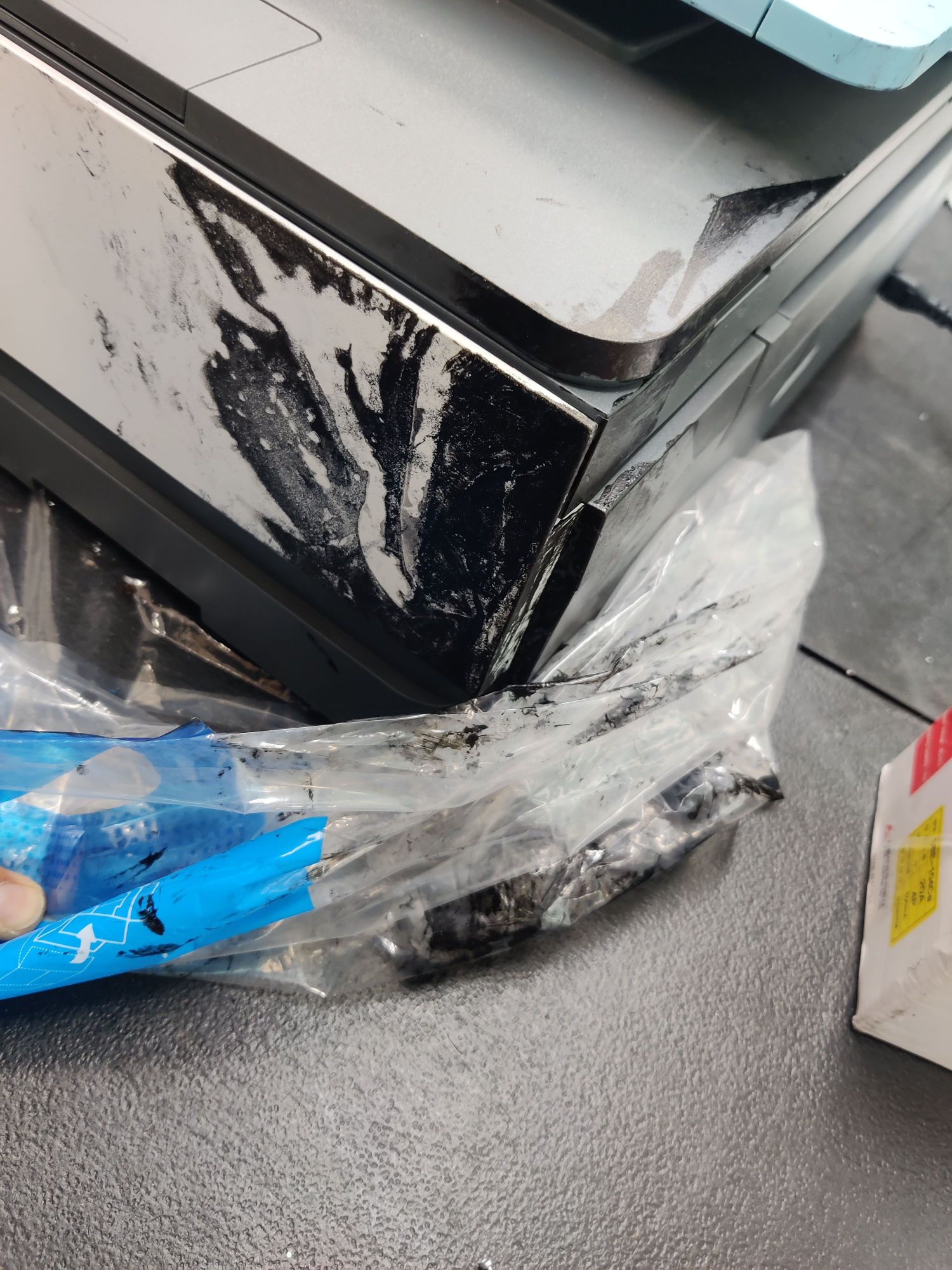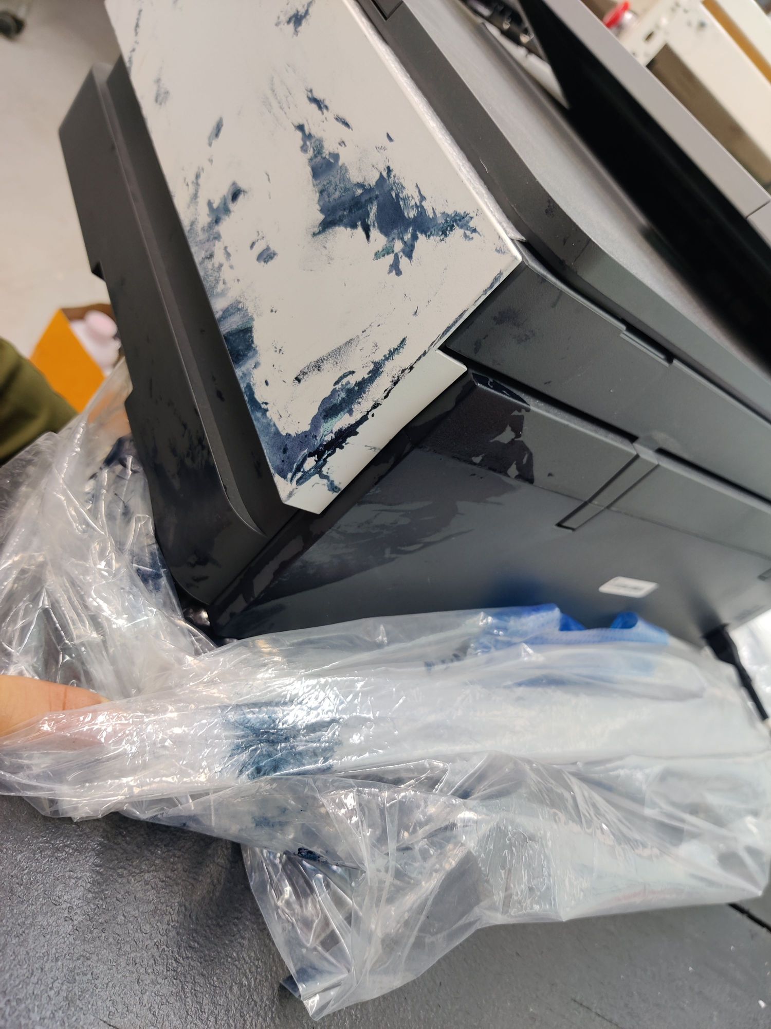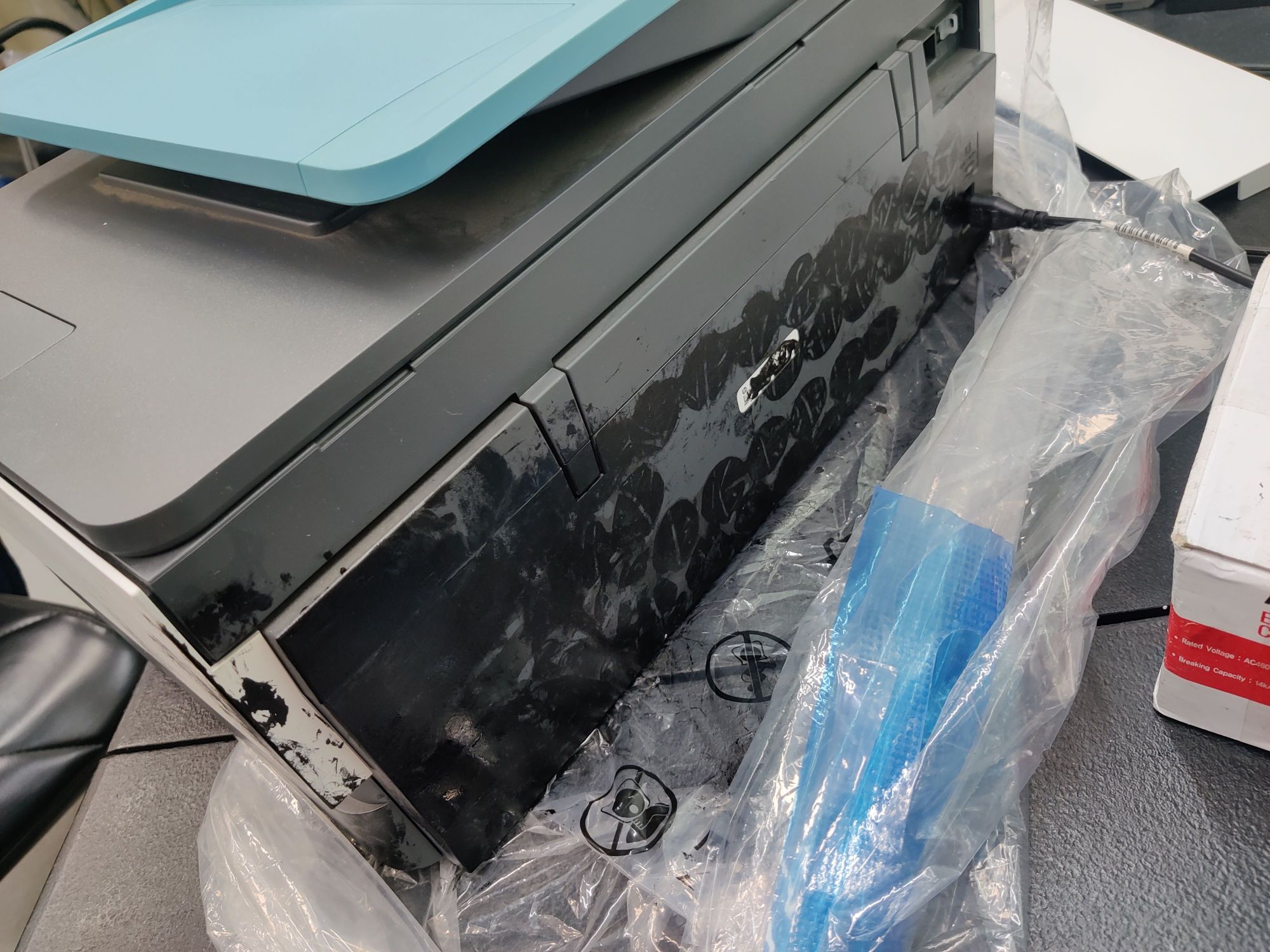 정상동작하지만 대용량 잉크 장착으로 잉크가 흘러 뒷판에 잉크가 묻어 있습니다.