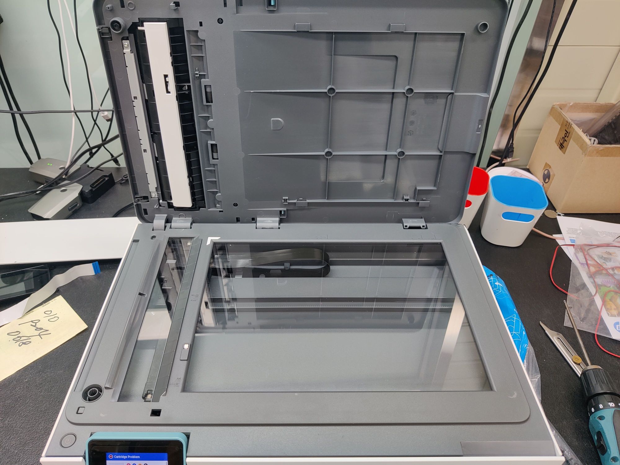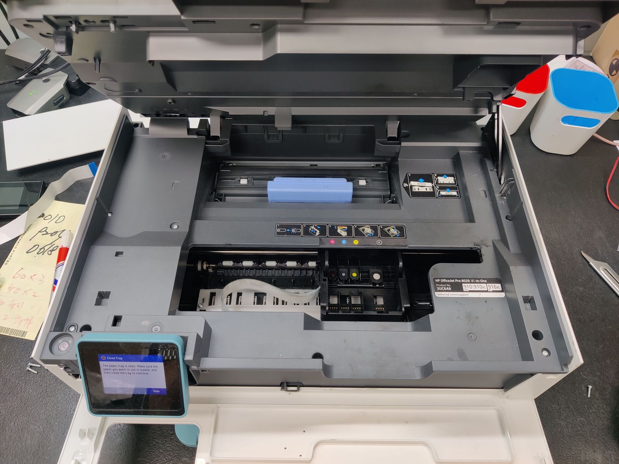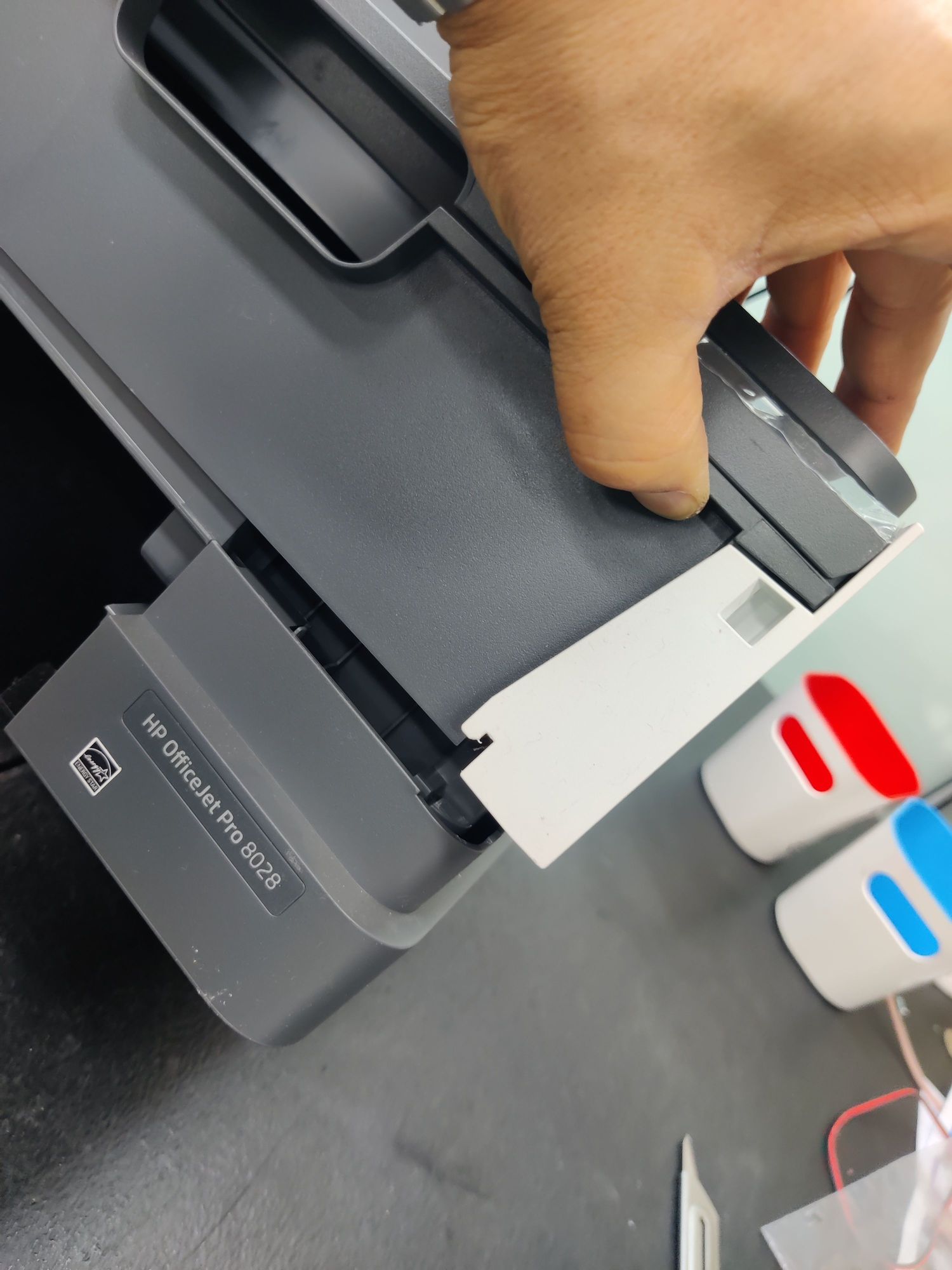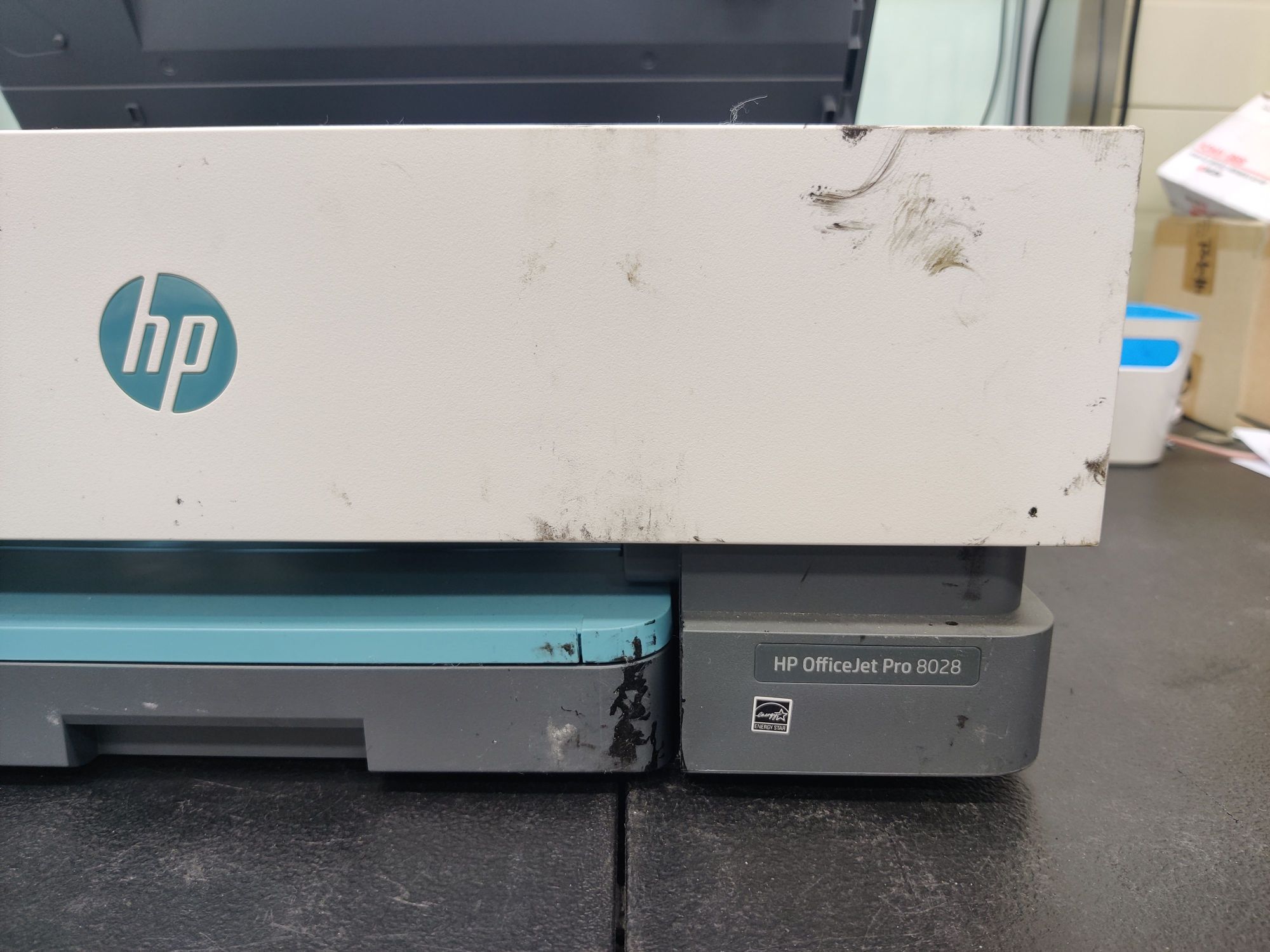정상동작하지만 대용량 잉크 장착으로 잉크가 흘러 뒷판에 잉크가 묻어 있습니다.